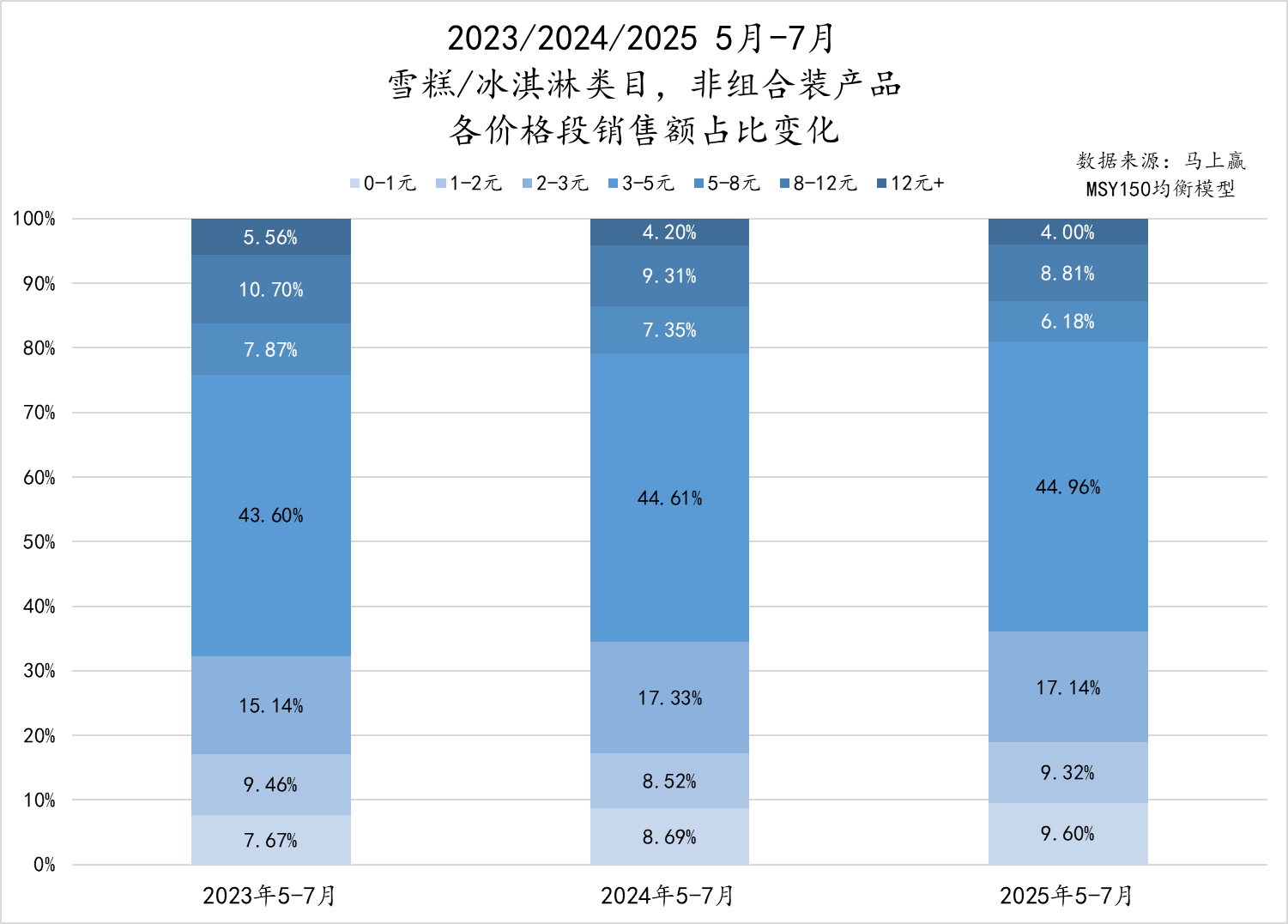 从雪糕/冰淇淋非组合装产品各价格段销售额占比来看,市场呈现明显的“低中价主导、高价收缩”趋势。