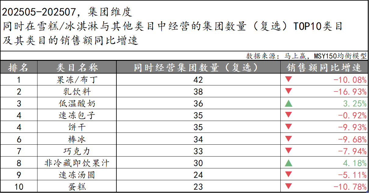 基于集团维度,马上赢拉取了在202505-202507时间段内,与雪糕冰淇淋类目有经营重合的集团数量的类目排名,可以看到,虽然消费大盘增长乏力是大家共同要面对的情况,但跨界而来的集团们,他们所在的类目也或多或少都面临着比大盘更严重的销售额同比下滑,其中果冻、乳饮料、蛋糕、饼干、棒冰、巧克力等,都是与近年来消费潮流与走向有一定背离的类目,这些类目中的集团或许跨界来到雪糕冰淇淋类目中的心情也更为急迫。