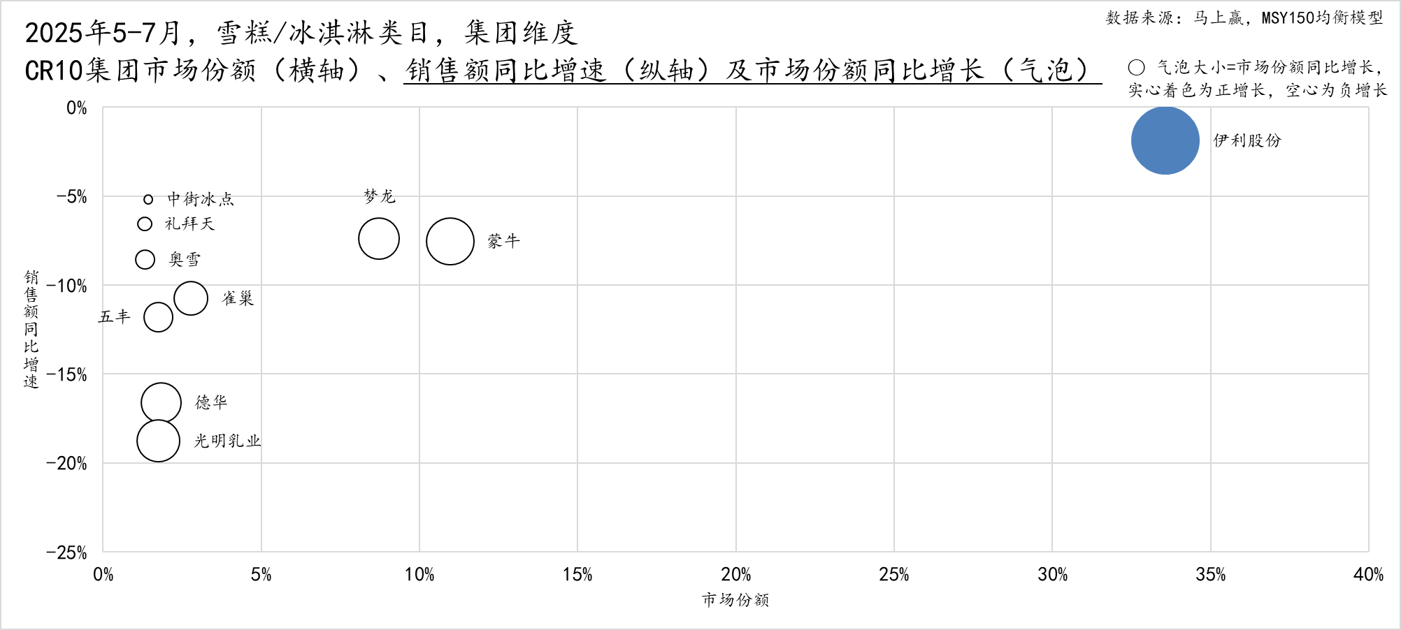 进一步观察类目集团/品牌的集中度情况,可以看到,在 2023–2025年5-7月期间,雪糕/冰淇淋类目的集中度整体保持相对稳定。集团层面,CR10集团的类目内市场份额从 2023 年的 66.5% 小幅下滑至 2025 年的 65.5%,而 CR20 则基本维持在 77% 左右,头部集团的市场份额略有削弱,但中腰部集团及时补位,整体变化不大。