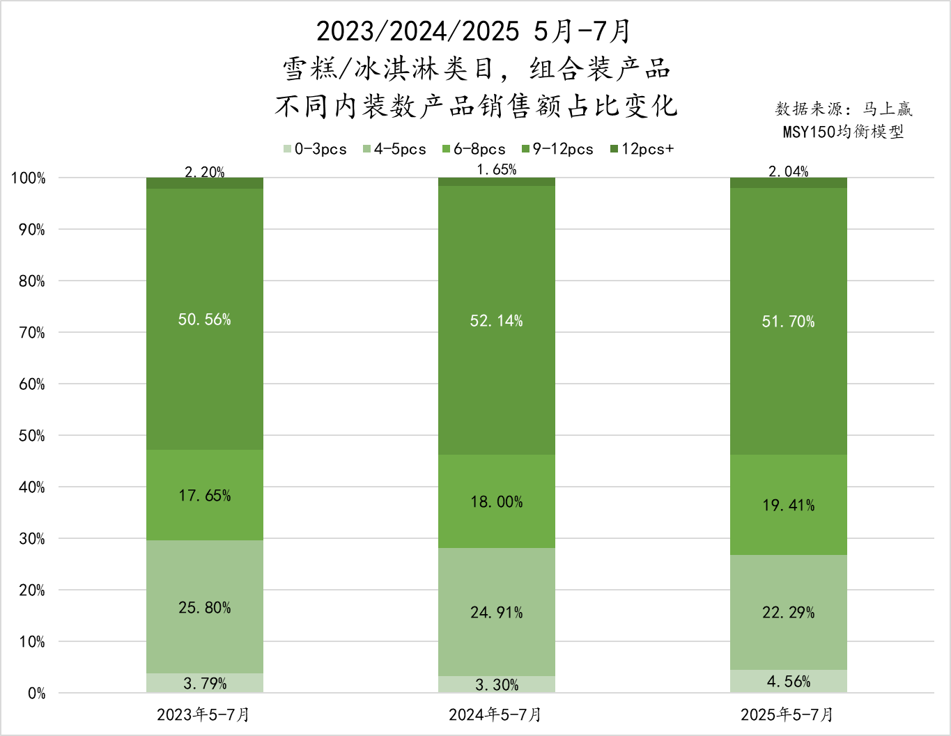 值得注意的是,0-3pcs 与 12pcs+ 的极端规格占比虽小,但都在 2025 年占比有所上升。其中,内装数0-3pcs的小规格组合装从 3.30% 升至 4.56%,内装数12pcs+的大规格组合装则在 2025 年微增至 2.04%。