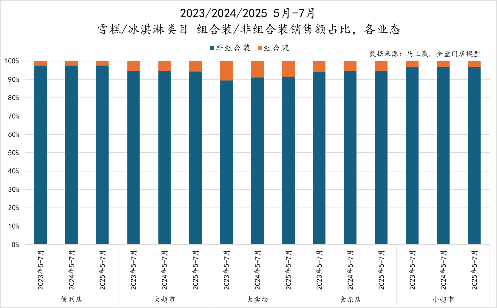 细分业态来看,组合装/非组合装在不同的消费场景与业态中占比差距颇大。非组合装在所有业态中依然占据主导,但大业态中组合装占比明显偏高。从三年观察期组合装/非组合装的占比变化来看,波动较大的是大卖场业态,其组合装占比有进一步缩小的趋势,推测可能与产品选择整体降级导致组合/非组合性价比差距变小,消费者更倾向于单次购买单次享用而非囤货消费相关,或许也与整体的健康消费趋势影响,导致消费者对于雪糕/冰淇淋这一类典型的高糖高能量产品的囤货意愿下降相关。