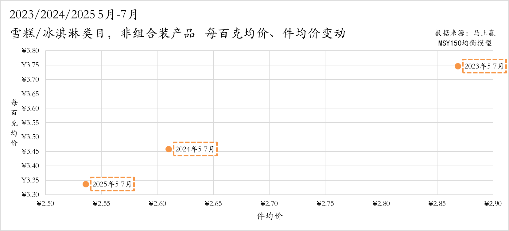 非组合装产品价格走势方面,雪糕/冰淇淋类目非组合装产品每百克均价和件均价都呈现逐年下降趋势。每百克均价从 2023 年约 3.75 元下降至 2025 年的 3.35 元,件均价从 2.9 元降至 2.55 元,同样承压较为明显。非组合装作为市场主流,件均价下降幅度相对平缓,且2025/2024相比2024/2023,其件均价、每百克均价下降幅度均有收窄,或同样体现出消费者的需求降级正在筑底阶段,趋于稳定。