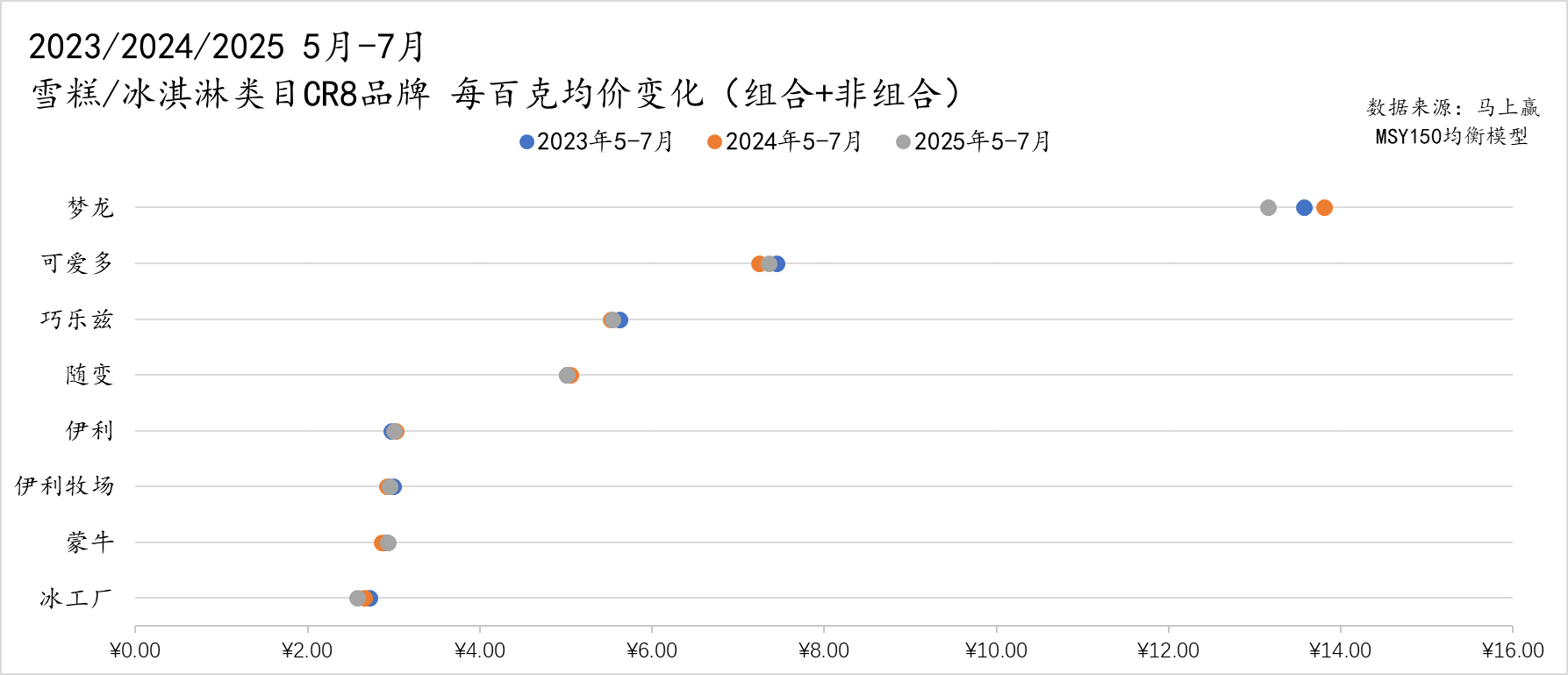 处于中段价格带的主要是巧乐兹和随变,两者的均价大致稳定在 5–6 元之间;在更低的价格带,伊利、伊利牧场、蒙牛和冰工厂则基本集中在 2–3 元之间,区间差别不大,三年来波动幅度也有限,价格端保持稳定。