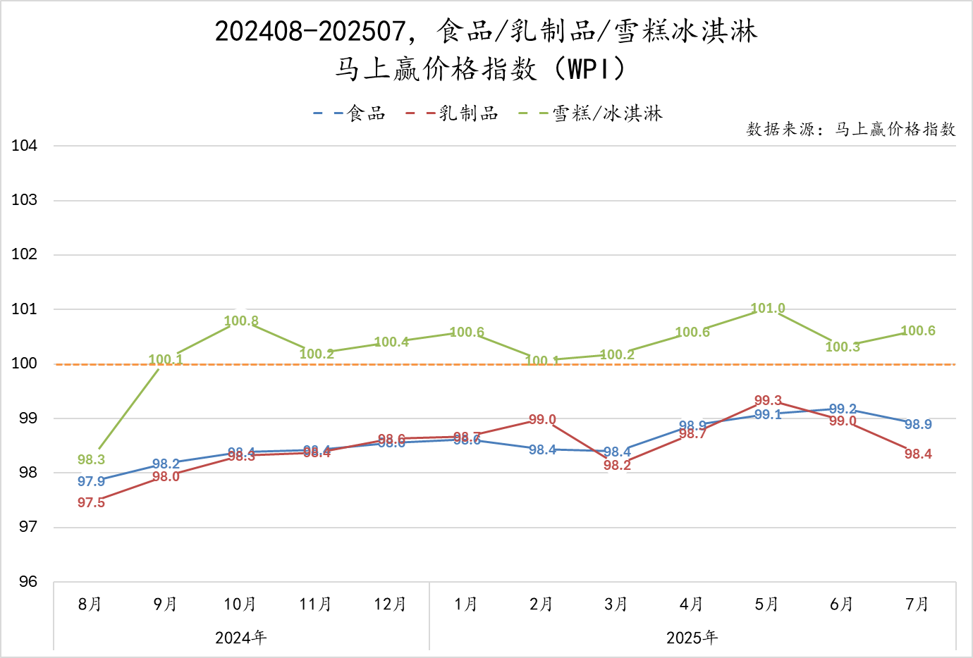 可以看到,从2024年8月至2025年7月,雪糕/冰淇淋走势表现突出。一方面,其指数自2024年9月以来均超过100,意味着相比自身,其类目价格水平一直处于同比正增长的状态当中,类目价格水平已经走出了前两年因“雪糕刺客”幻灭而导致的价格水平显著下滑;另一方面,与其上级类目乳制品,以及食品大类整体的价格指数相比,雪糕/冰淇淋类目的走势显著强于后两者,意味着其价格水平较大盘整体有着更好的表现。