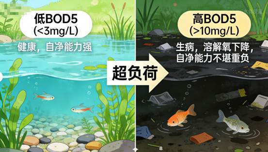 BOD5 直接决定水体功能等级,核心场景限值如下,超限时需启动污染管控: