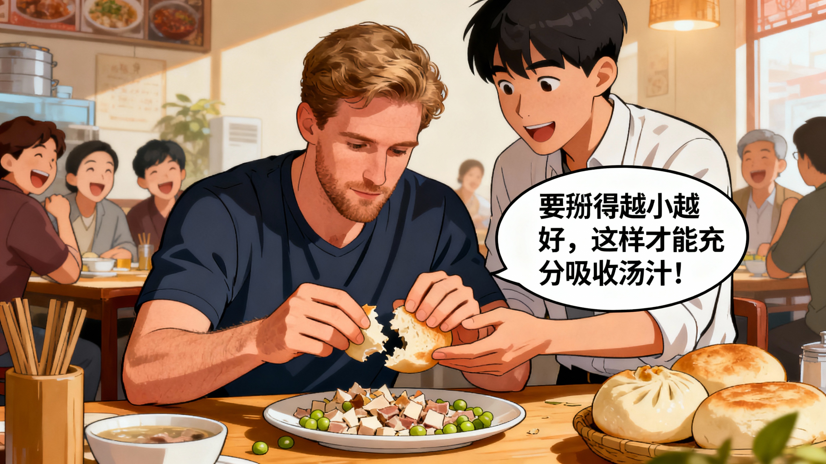 当然一碗面只是个开端,特雷弗接着带他去体验羊肉泡馍,