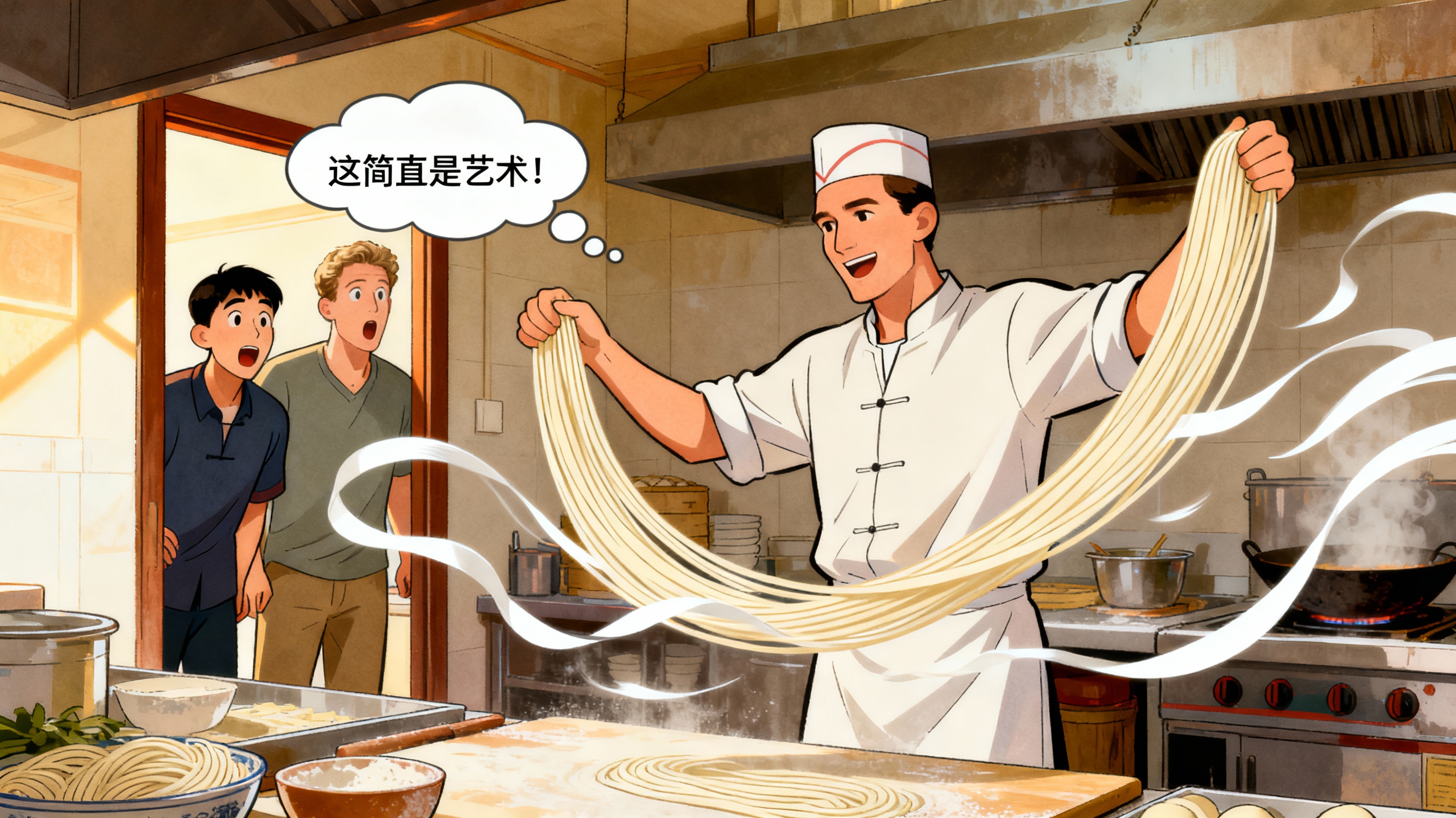 等候之际,他们溜进厨房,见一位师傅正娴熟地扯面团,宽宽的面条似白色绸带在空中飘舞,