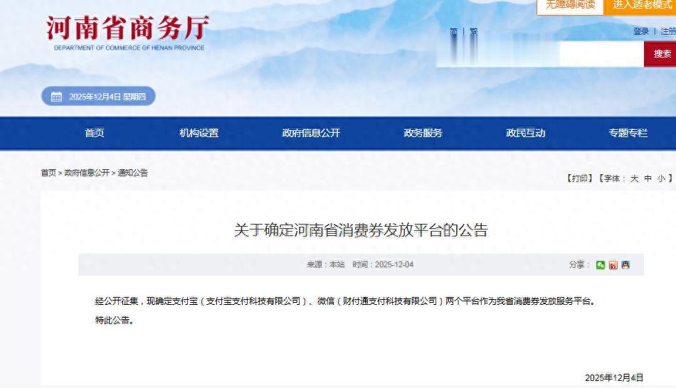 12月4日,河南省商务厅发布公告,确定支付宝(支付宝支付科技有限公司)、微信(财付通支付科技有限公司)两个平台作为河南省