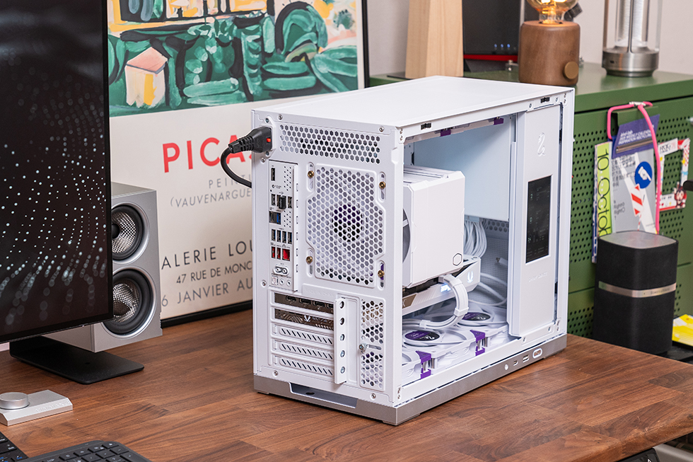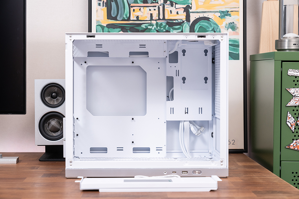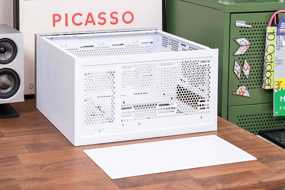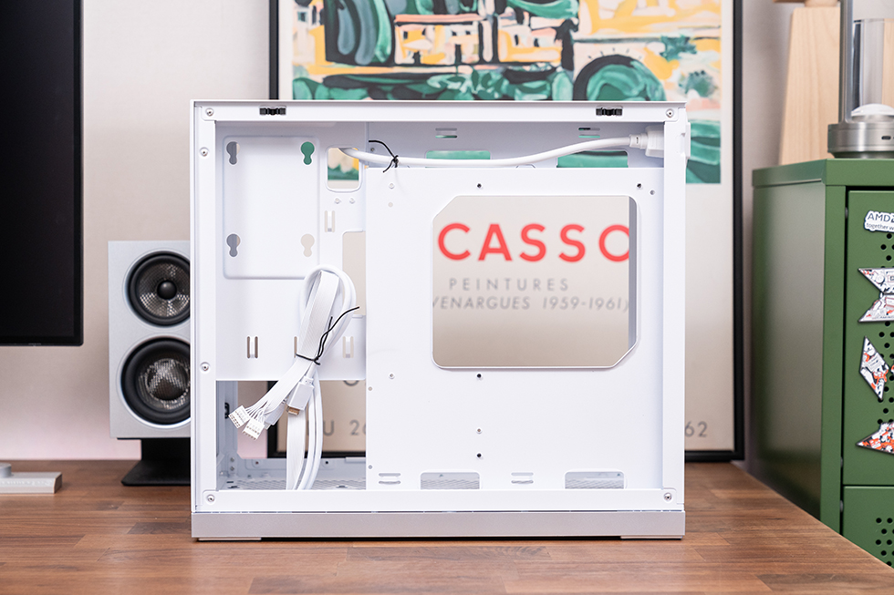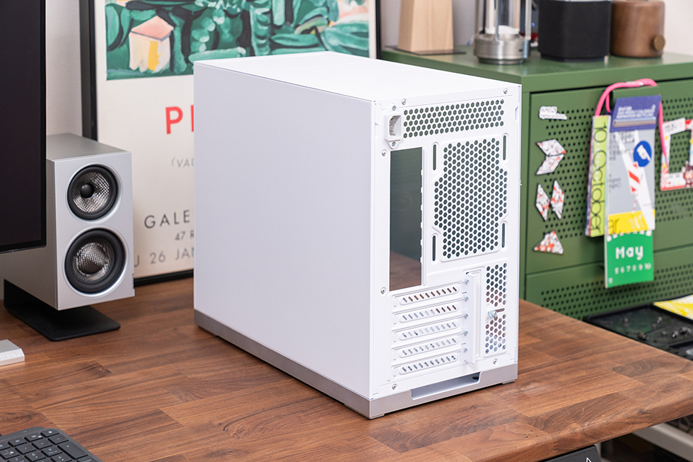 机箱的背面,主板区域采用大面积开放设计,更方便扣具的安装。围绕主板区域,设置了多处过线孔,左侧内凹设计给予充足的离线空间,优化了理线过程。背部左侧上方还提供了1个2.5寸硬盘安装位。