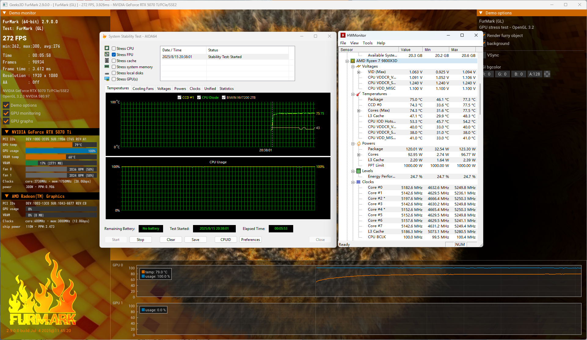 双烤温度测试,IPO开启 ,CPU 123W,最高温度77℃,显卡温度79℃。