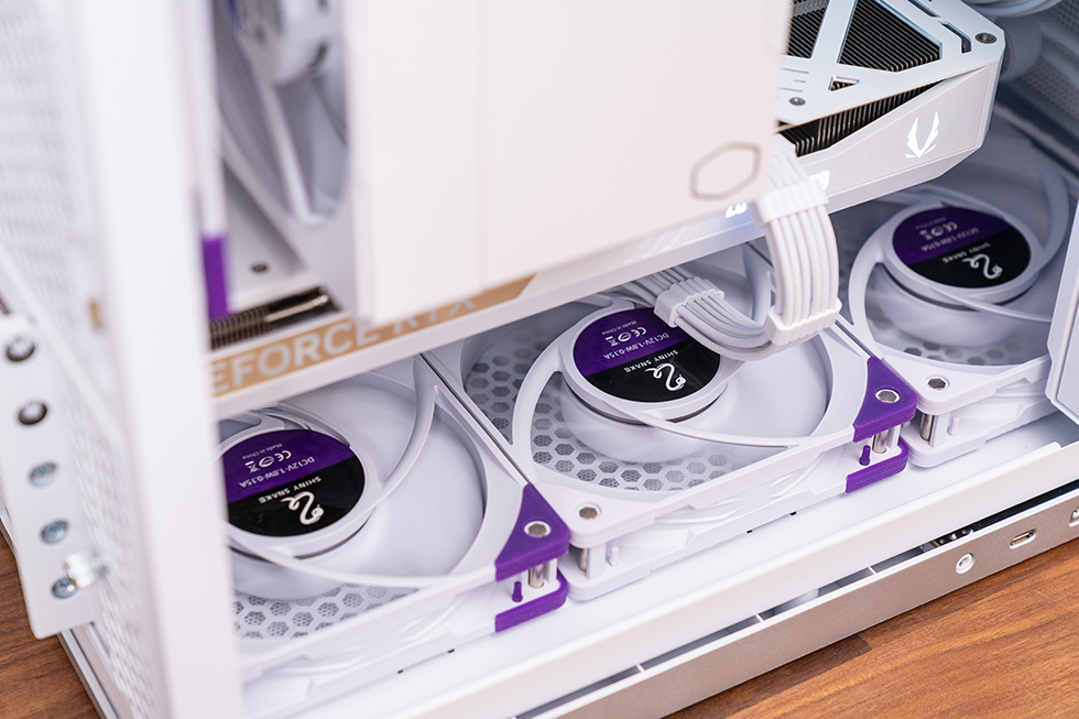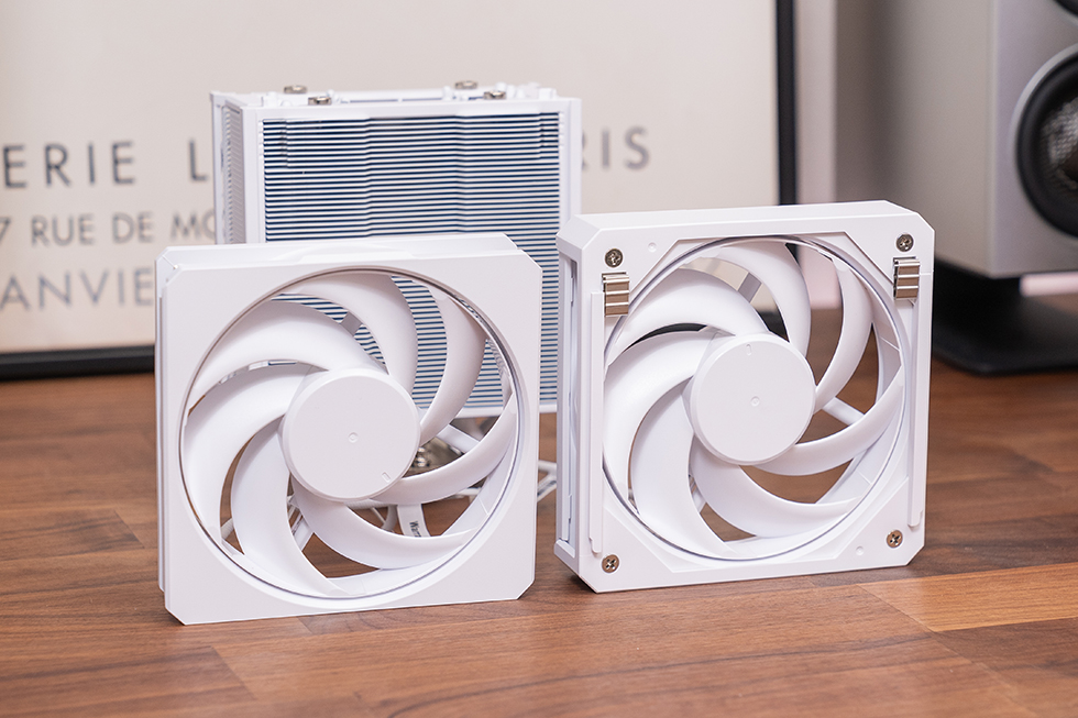 配备两个 120*120*25 mm的莫比乌斯120P风扇,通过滑轨卡扣和塔身连接。采用 LDB 回油轴承,转速区间 0~2400 RPM,最大风量 75.2 CFM,最大静压 3.63 mmH2O,最大噪声 30 dB(A),在保持高效散热的同时最大限度地降低噪音水平。