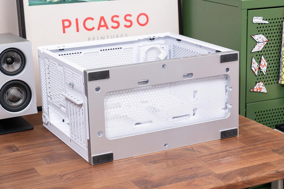 最后看一下机箱底部,一体成型的底部框架,预留了风扇螺丝的安装开孔,同样配置了防尘网,有效防止底部进风带来灰尘。