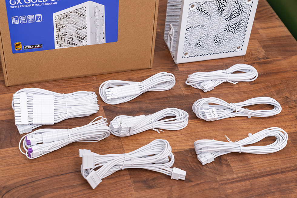 GX Gold Plus 850W外观经过重新设计,有黑白双色可选,本次选用的为白色,电源的三维尺寸为 140x150x86mm,与市面上的 ATX 电源基本一致。内置 120mm FDB 动态液压轴承风扇,风扇采用 7 片式设计,风扇运行更加稳定且安静,在提高散热效果的同时进一步降低了电源运行时的噪音。