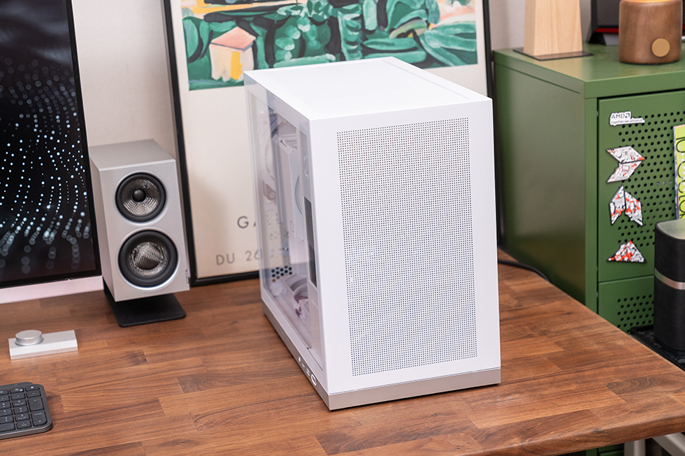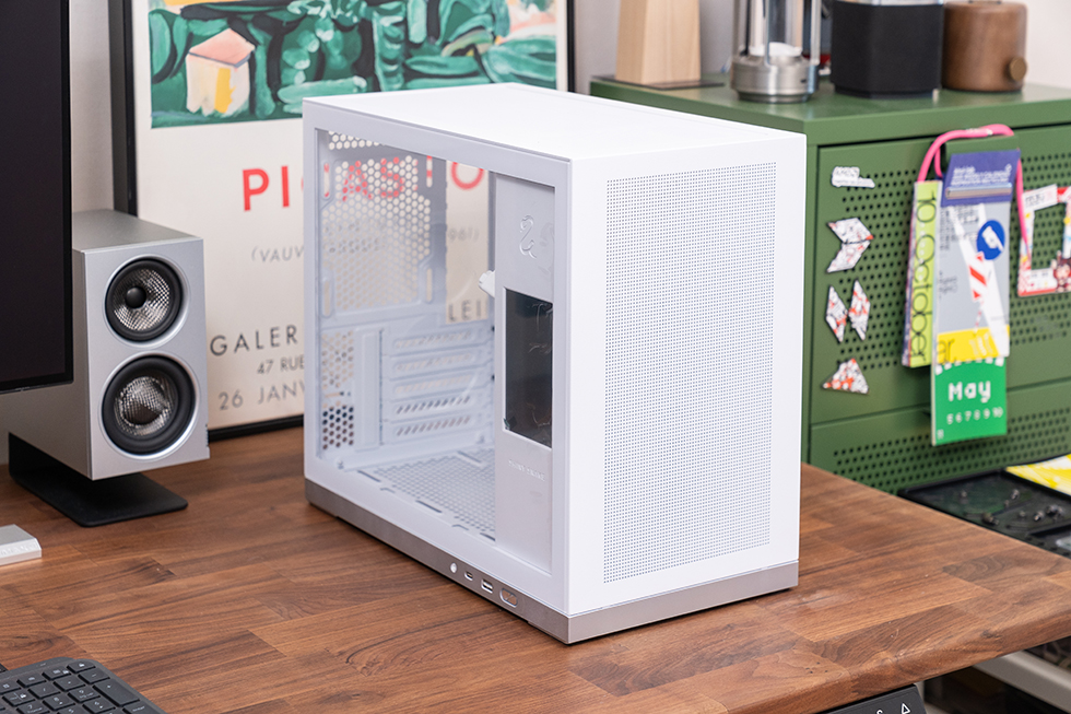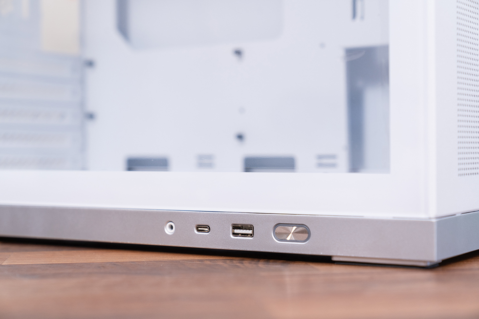 机箱底部区域和主体做个色块分割,IO面板以条形序列放置在了侧面底部,视觉上十分协调。依次为开机键(开机后按钮有白色灯效),Type-C(10Gbps)和USB 3.0接口。