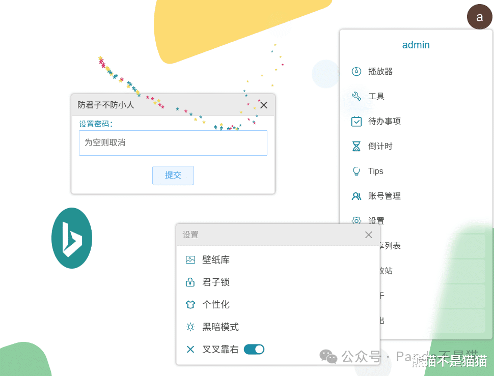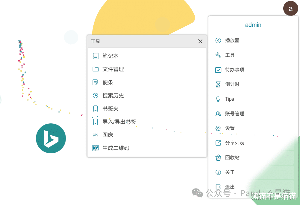 点击右上角的用户就能呼出其他功能项了,其中包括播放器、笔记、文件管理、便条、图床、二维码生成、待办、倒计时等等,也能对网页进行设置。