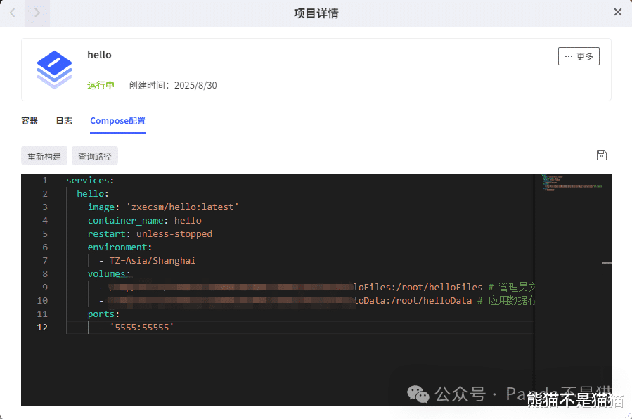 随后来到极空间的Docker界面,在Compose中新建项目,输入以下代码,其中的文件路径可通过极空间的查询路径来获得,端口左侧的本地端口记得更改为不冲突的端口。