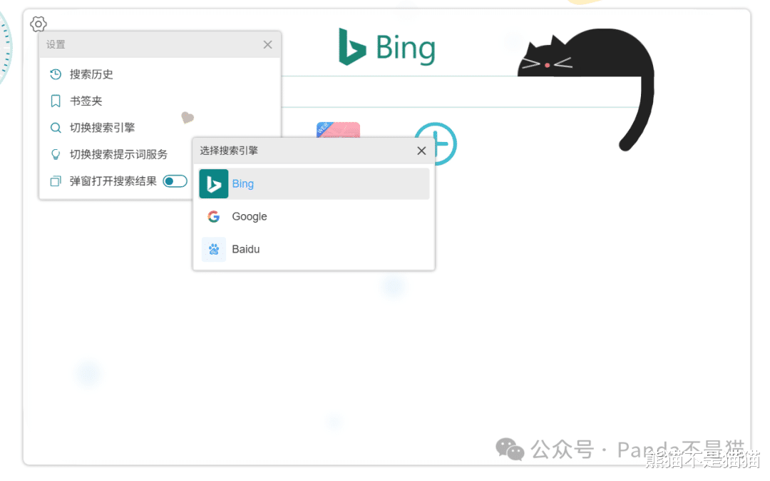 点击正中间的图标能呼出书签栏,添加书签只需要输入网址,能自动获取网址的图标和描述,右上角的设置支持查看搜索历史、书签夹、搜索引擎切换、提示词切换以及弹窗搜索。