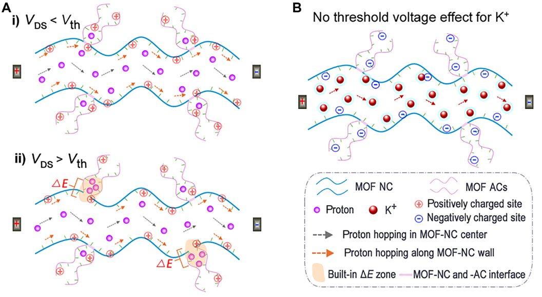 总的来说,他们证明基于金属有机框架的多维异质结纳米流控器件可以实现前所未有的非线性选择性离子传输,即能够实现类三极管的非线性质子传导。值得一提的是,这种饱和现象的非线性质子传输源于金属有机框架本征纳米尺度通道-埃级尺度通道(NC-AC,Nanoscale Channel-Angstrom-scale Channel)结两端内建电势的门控效应,而这种效应是通过质子特有的跨相传导实现的。