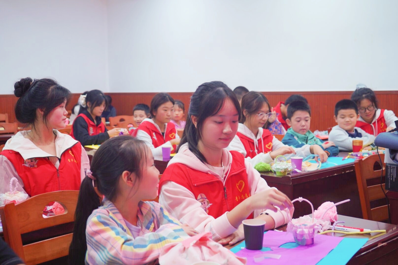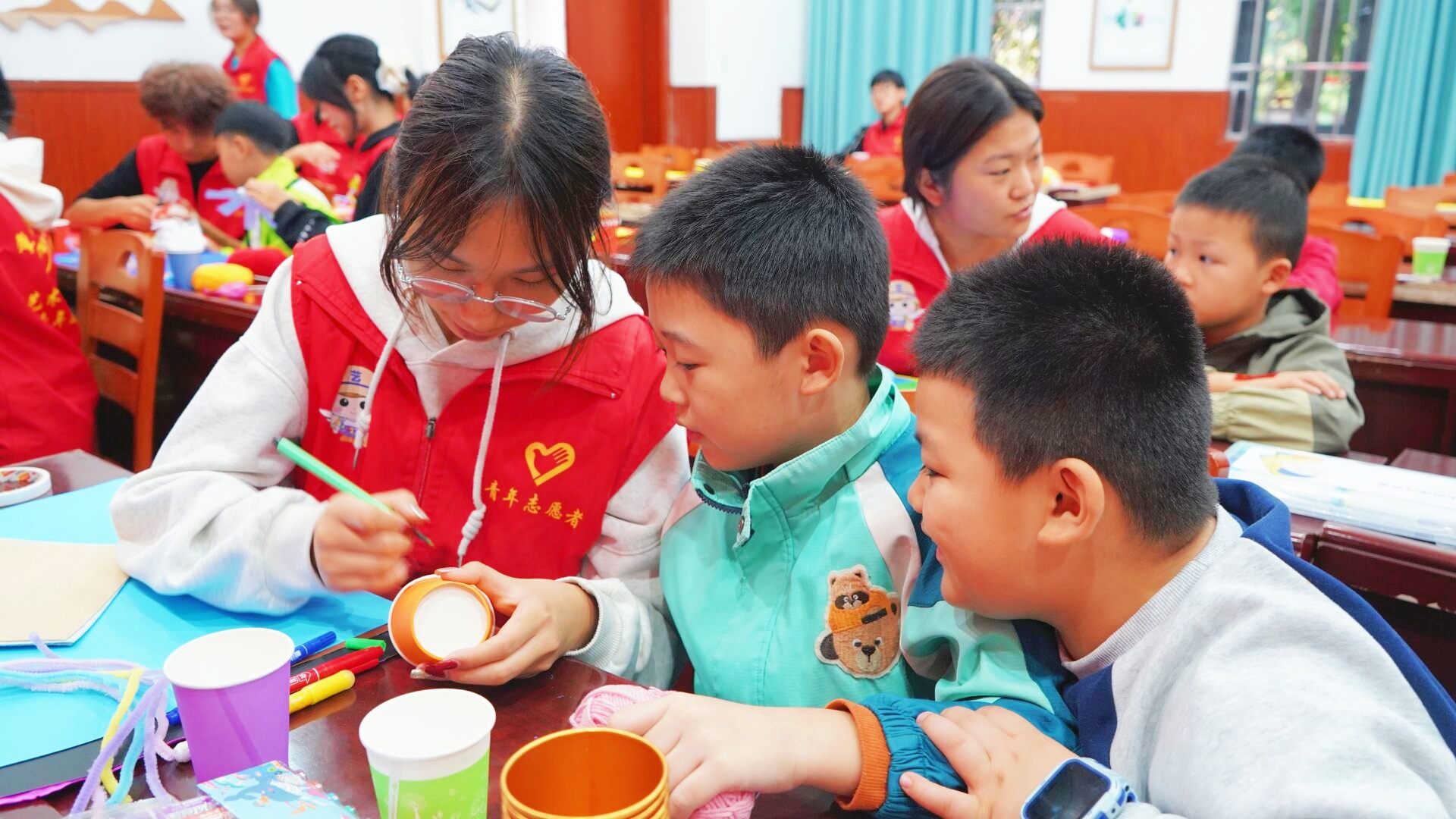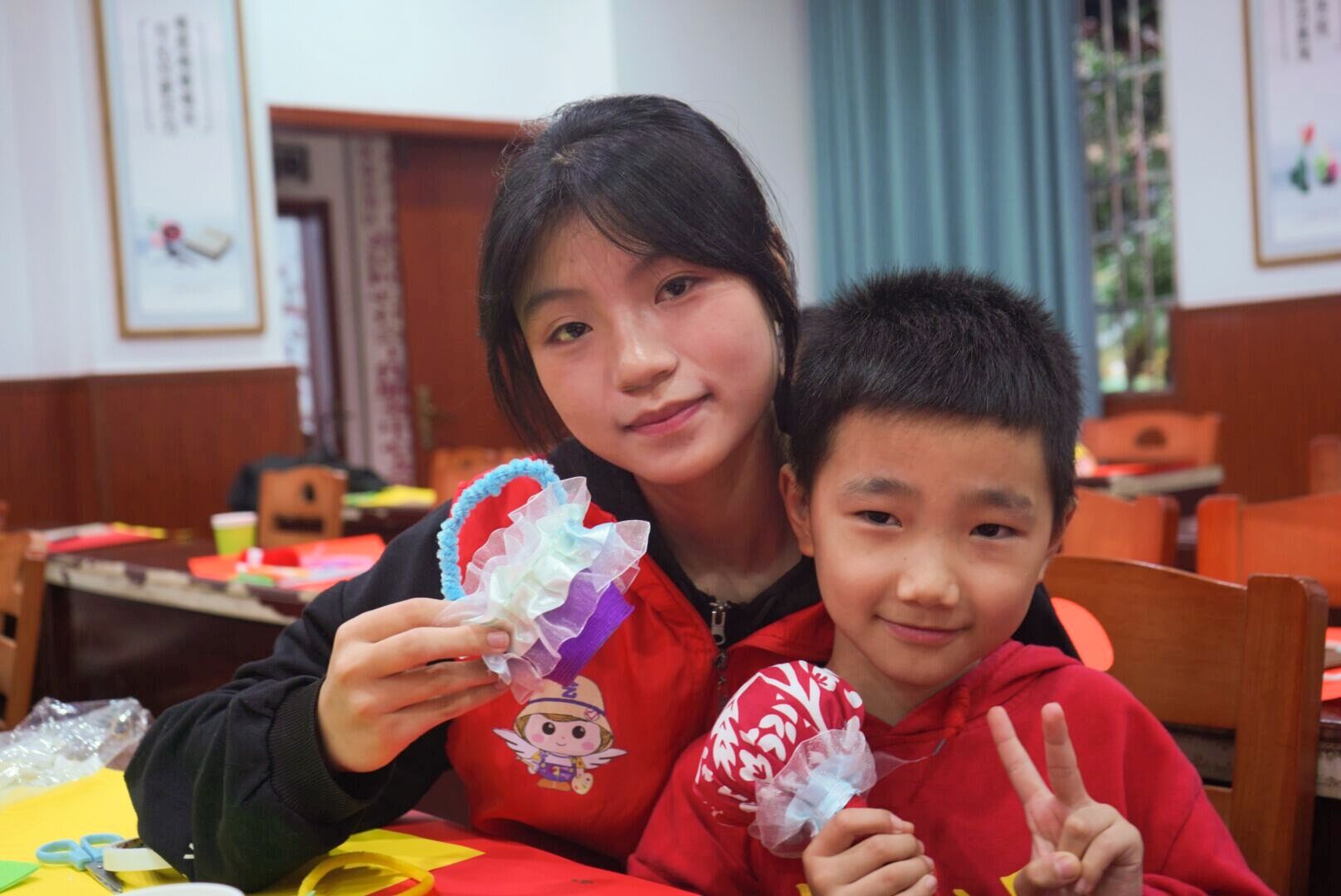 小手忙创作,笑脸映温暖。手工实践环节,孩子们在志愿者的陪伴与细致指导下,亲手制作感恩花篮与艾草捶。彩纸在指间折叠出纹路,毛线缠绕出温暖,艾草填充进满满心意,每一步操作里,都藏着孩子们对长辈的祝福与思念。现场气氛温馨而专注,孩子们专注的眼神、灵巧翻飞的小手,以及作品完成时脸上绽放的灿烂笑容,共同构成了这个秋日里最动人的画面。作品完成后,孩子们依次上台介绍自己的创作理念,稚嫩的话语中满载着对老人的敬爱与关怀。这一份份由质朴又真挚的心意,也将会联动美“益’约志愿服务专项支队送给大岚村的老人们,将感恩传递到每一位长辈的心田。