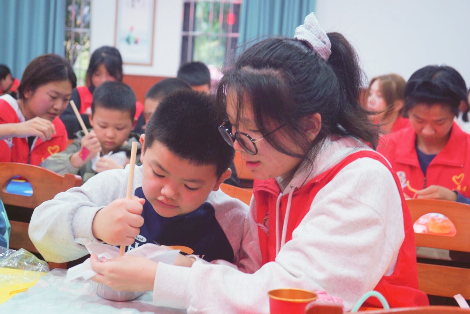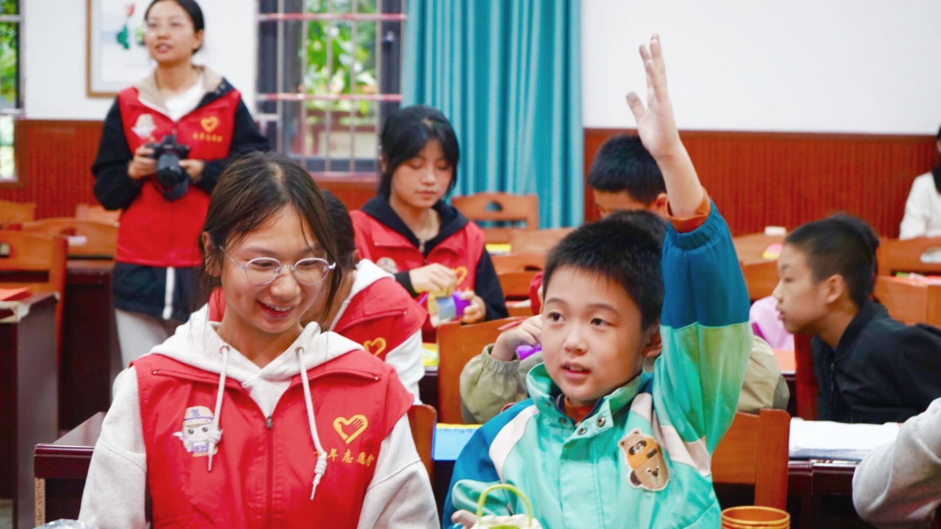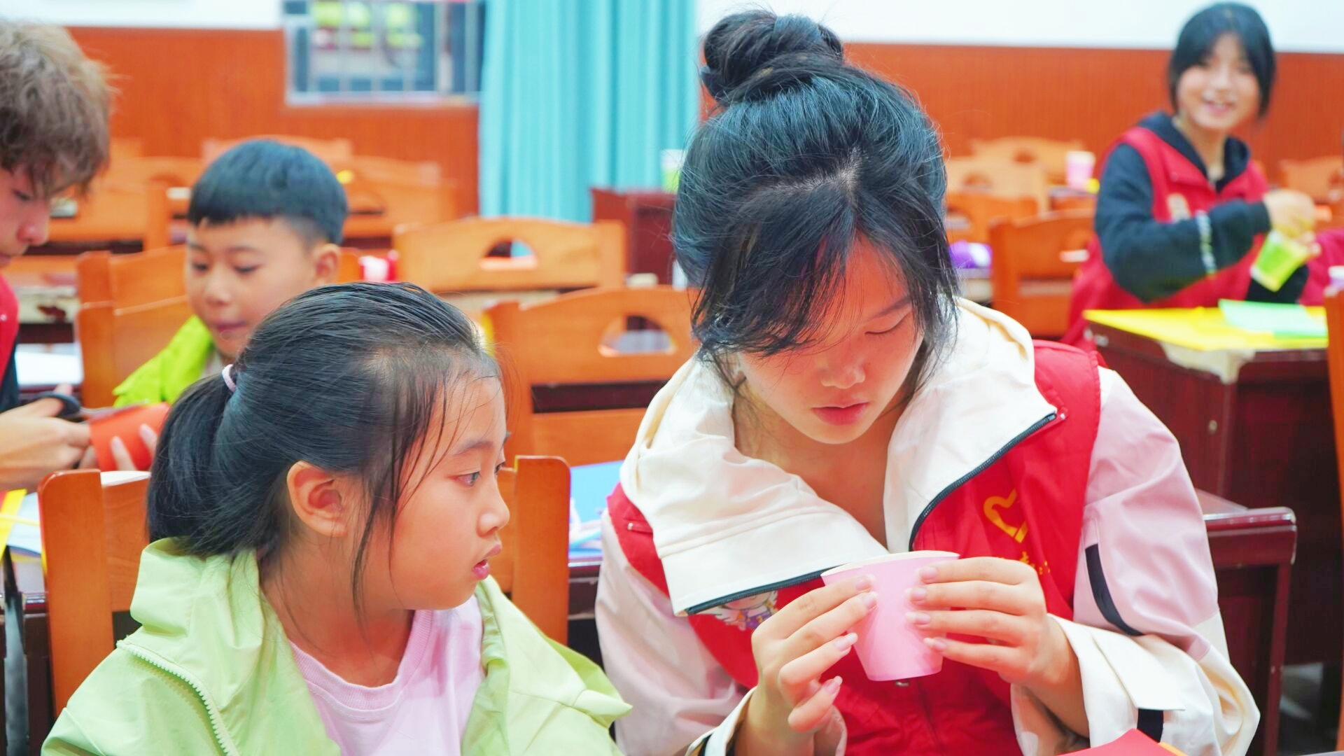 小手忙创作,笑脸映温暖。手工实践环节,孩子们在志愿者的陪伴与细致指导下,亲手制作感恩花篮与艾草捶。彩纸在指间折叠出纹路,毛线缠绕出温暖,艾草填充进满满心意,每一步操作里,都藏着孩子们对长辈的祝福与思念。现场气氛温馨而专注,孩子们专注的眼神、灵巧翻飞的小手,以及作品完成时脸上绽放的灿烂笑容,共同构成了这个秋日里最动人的画面。作品完成后,孩子们依次上台介绍自己的创作理念,稚嫩的话语中满载着对老人的敬爱与关怀。这一份份由质朴又真挚的心意,也将会联动美“益’约志愿服务专项支队送给大岚村的老人们,将感恩传递到每一位长辈的心田。
