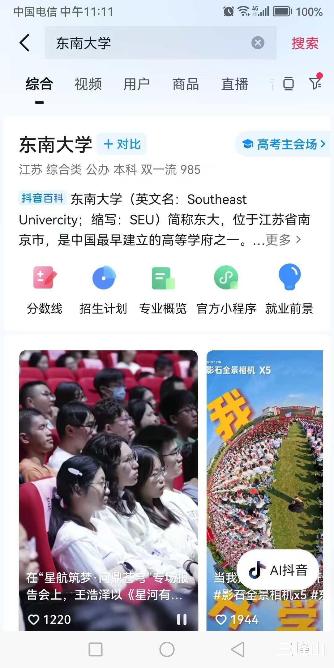 4、抖音功能,这是最让我诟病的一块,还是搜索这一块。点击搜索某项内容,下面会关联综合、用户、商品、直播等选项,可以选择自己感兴趣的内容。比如搜索东南大学,有学校简介,相关视频,还有学校的专业分数线,招生计划等等,相当相当方便。