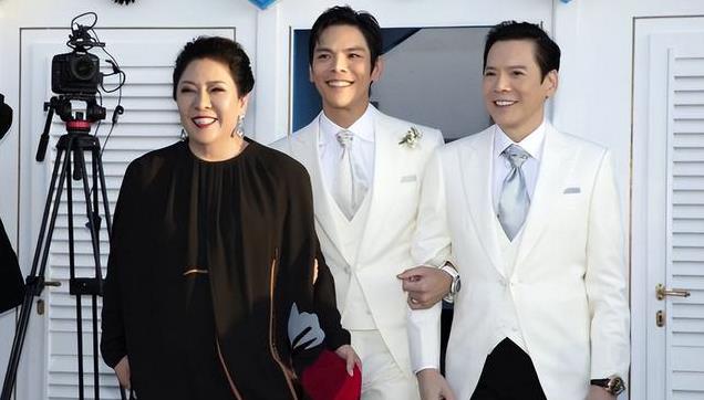 他先是身着一袭米色风衣亮相,内搭紫色丝巾,手腕上的佛珠和金表格外惹眼。