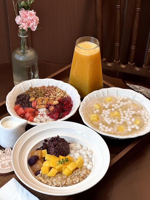 手工制作的糖水甜度刚好,完全不腻。杨梅冰汤圆酸甜清爽,芋圆 QQ 弹弹裹着冰沙,芋泥鲜果布丁碗料超丰富,椰奶打底搭配新鲜水果和斑斓奶冻,解腻又爽口。