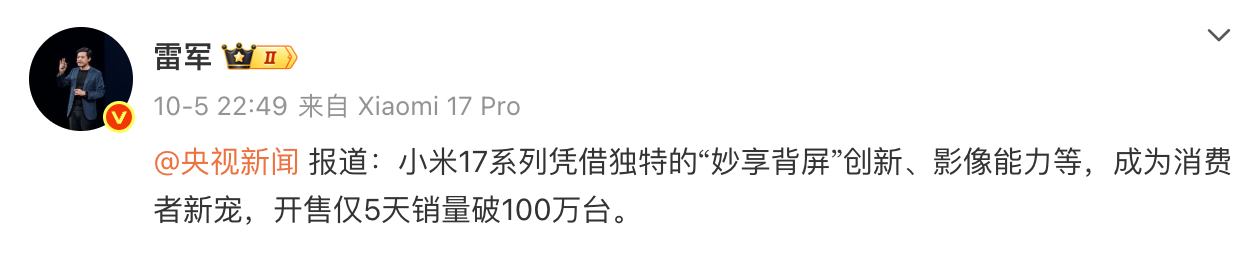 根据雷总发布的消息,小米 17 系列开售仅 5 天,总销量就超过 100 万台了,可见今年的新策略确实很有效。不过,这种对标 iPhone 的策略,也让不少网友误以为 Pro Max 就是超大杯。
