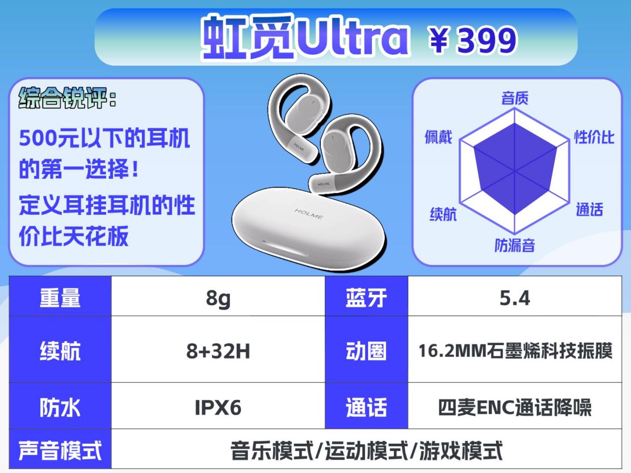 总结:如果想选性价比高的,虹觅 Ultra 肯定是首选,不管是佩戴舒适度、音质还是防漏音,表现都很亮眼,日常通勤、上班、学习用都合适,学生党和上班族可以重点考虑。