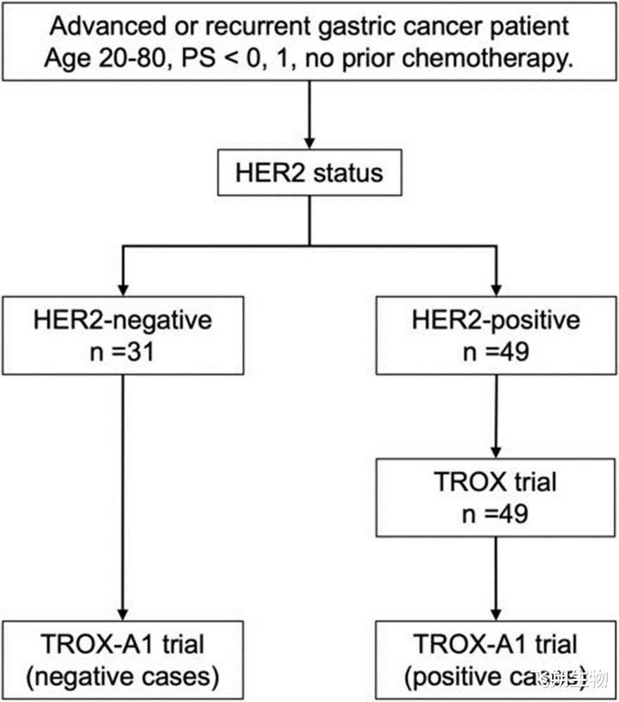 传统意义上胃癌是指原发于胃的上皮源性恶性肿瘤。根据2022年汇总数据,胃癌是全球发病率和死亡率第五的常见恶性肿瘤,发病率约为97万/每年、死亡约为66万/年[1]。人表皮生长因子受体2(HER2)是胃癌常见的重要靶点,大约12%-18%的胃癌患者会出现HER2过表达或基因扩增[2.3]。HER2阳性晚期胃癌一线治疗中,曲妥珠单抗是抗HER2靶向治疗的基石,对于PD-L1 CPS≥1患者,也可采取PD-1单抗+曲妥珠单抗+化疗的联合方案[4]。为了更深入地了解HER2阳性和阴性胃癌患者之间的基因特征差异,研究人员对TROX-A1试验中80例HER2阳性和阴性胃癌患者的基因特征进行了深入分析,旨在探究HER2阳性和阴性胃癌患者可能影响肿瘤进展和治疗反应的基因特征,从而为胃癌的个性化治疗提供新的思路和方法。