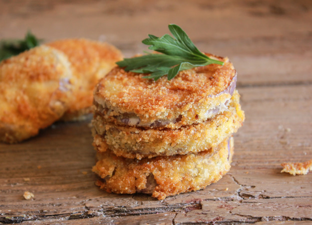 材料:1杯玉米淀粉、2个鸡蛋、1/2茶匙盐、1/2茶匙胡椒粉、1杯面包屑、2条紫茄子,植物油、柠檬适量。
