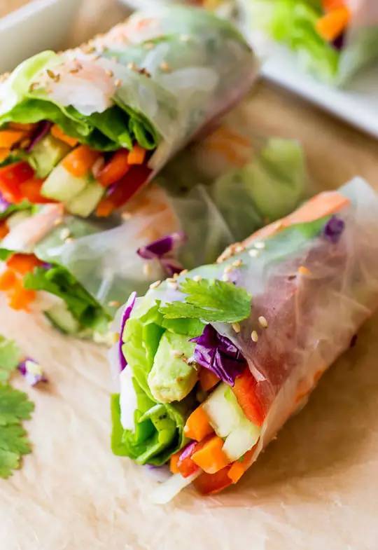 材料:1根胡萝卜、200g豆腐、1 / 4棵紫甘蓝、2个彩椒、3根葱、米纸(可用春卷皮代替)、一小捆香菜、几片薄荷叶(可选),花生碎、芝麻酱、盐、胡椒粉、酱油、蒜瓣适量。