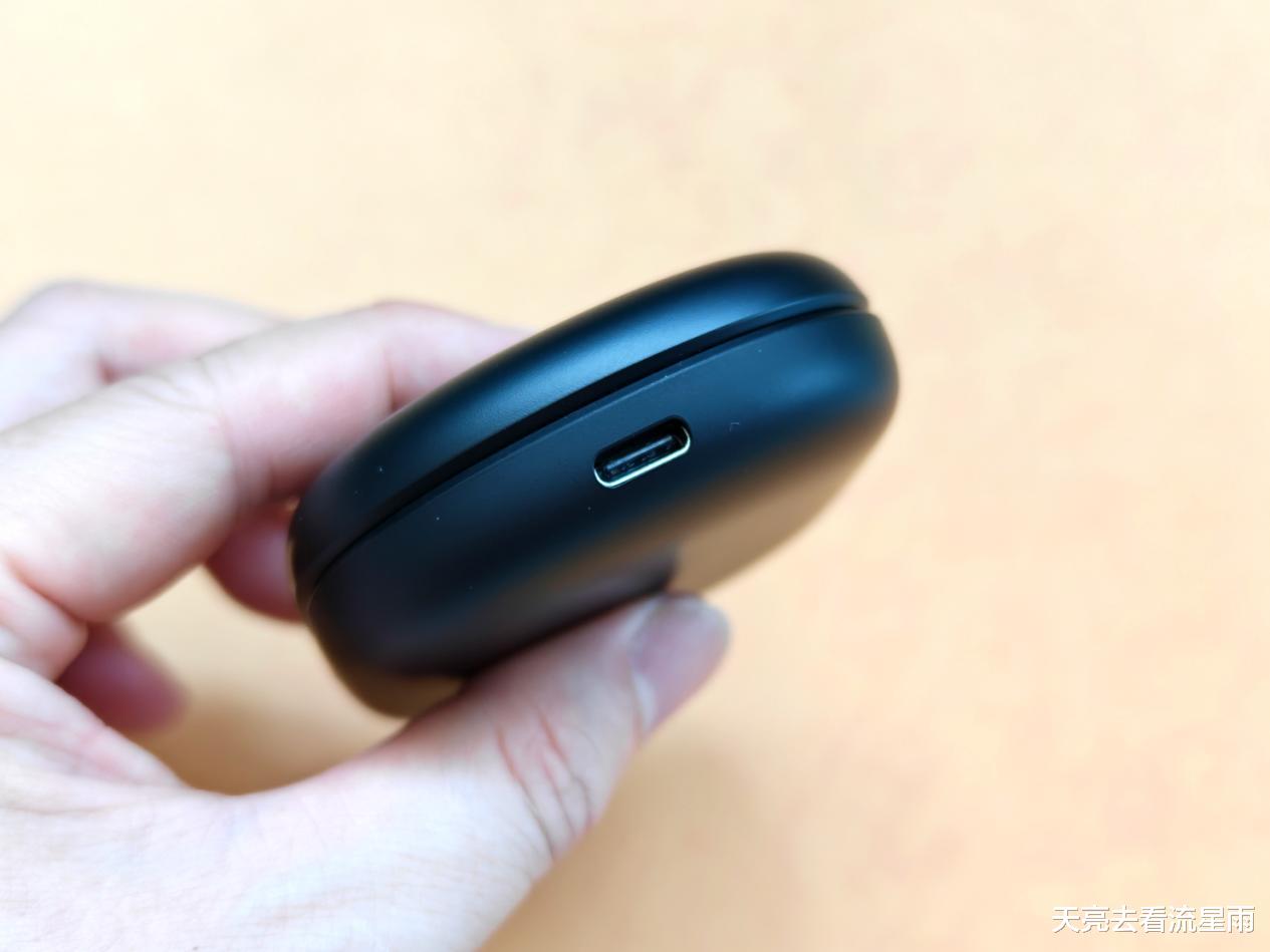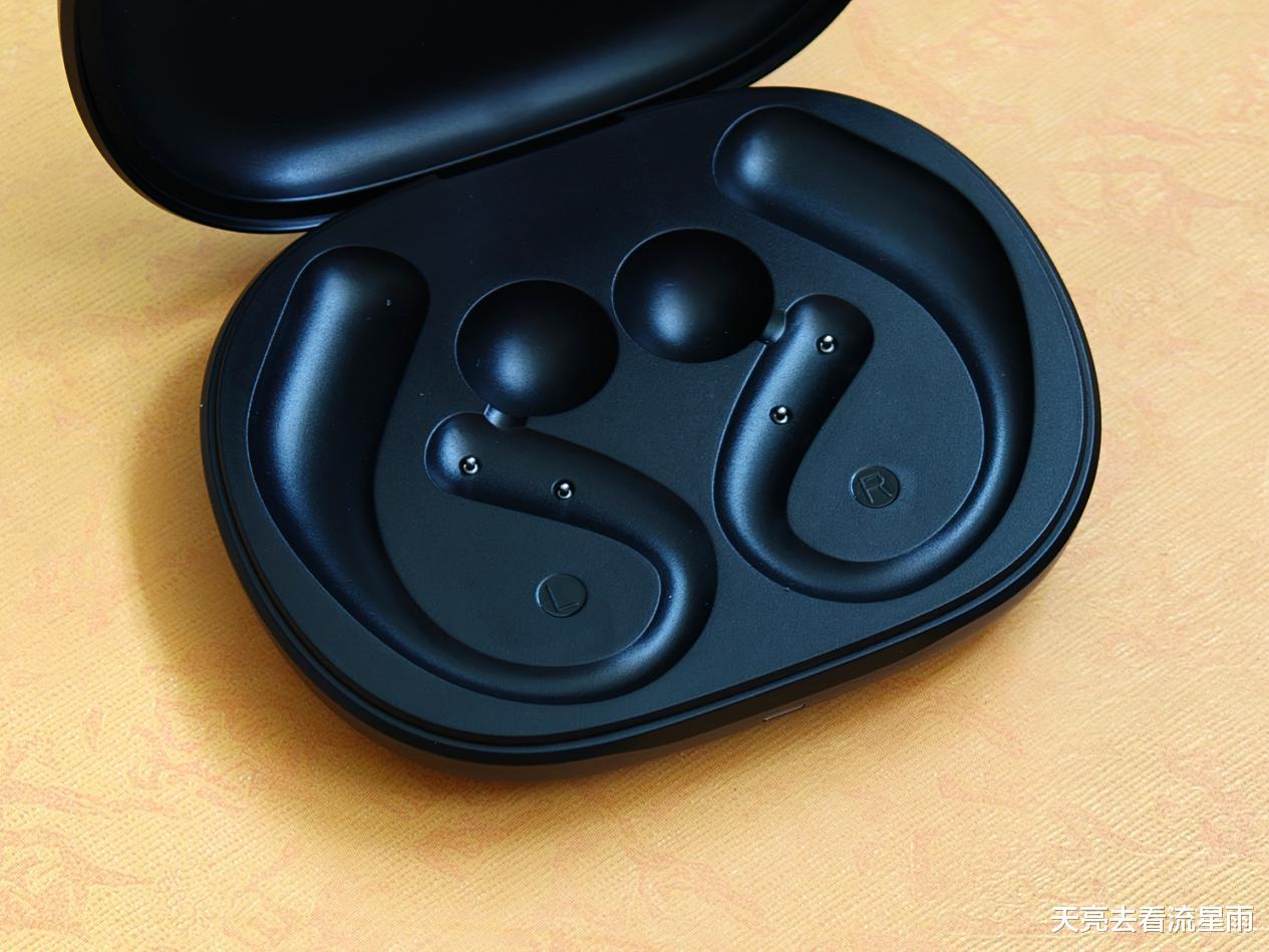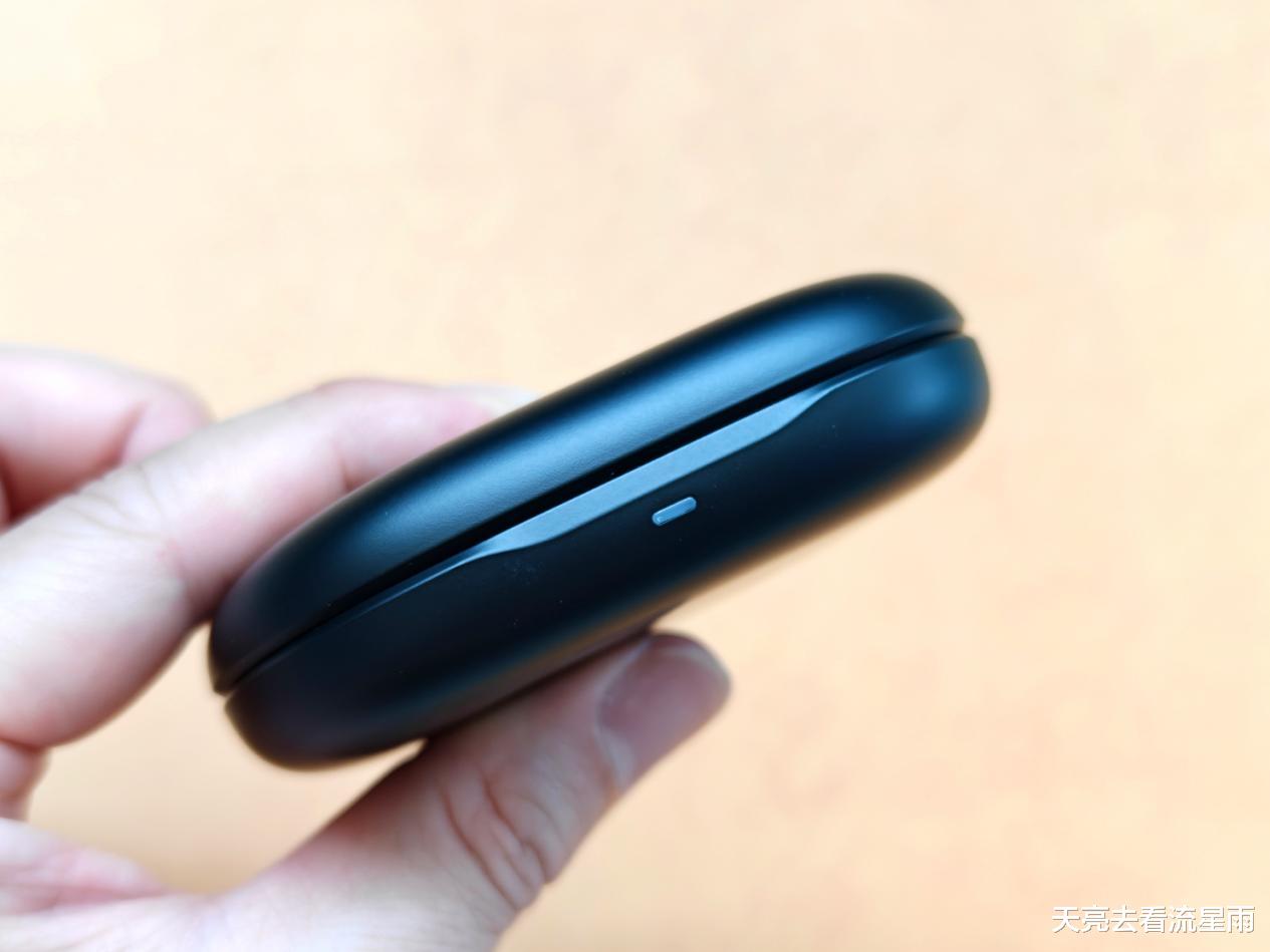 耳机机身采用航空级亲肤硅胶材质,具有较好的柔韧性和耐用性,触感柔软舒适,佩戴贴合无压迫。耳挂部分设计的也很精妙,佩戴时很稳固,实测进行比较剧烈的运动如跑步、打羽毛球都没什么问题。充电仓的开合位置设计有凹槽方便开启,凹槽下方有电量指示灯。