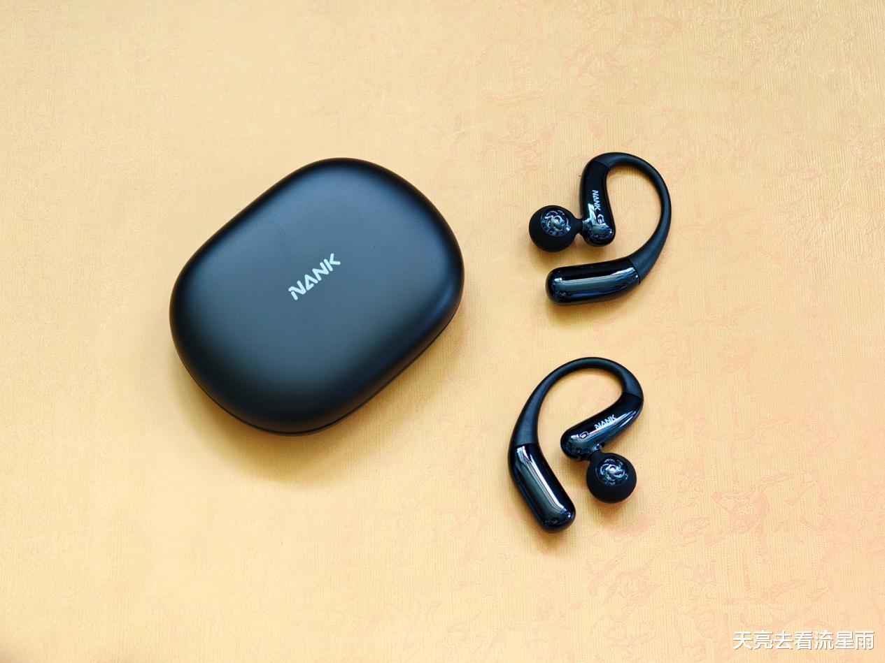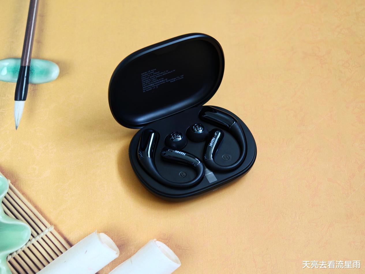 充电仓整体黑色为主,中央印有品牌logo,该耳机另有一款卡其色款。南卡OE Nova耳机的造型设计比较独特,融合挂耳式、入耳式、耳夹式三种耳机类型,不过个人感觉整体还是偏向于挂耳式设计。