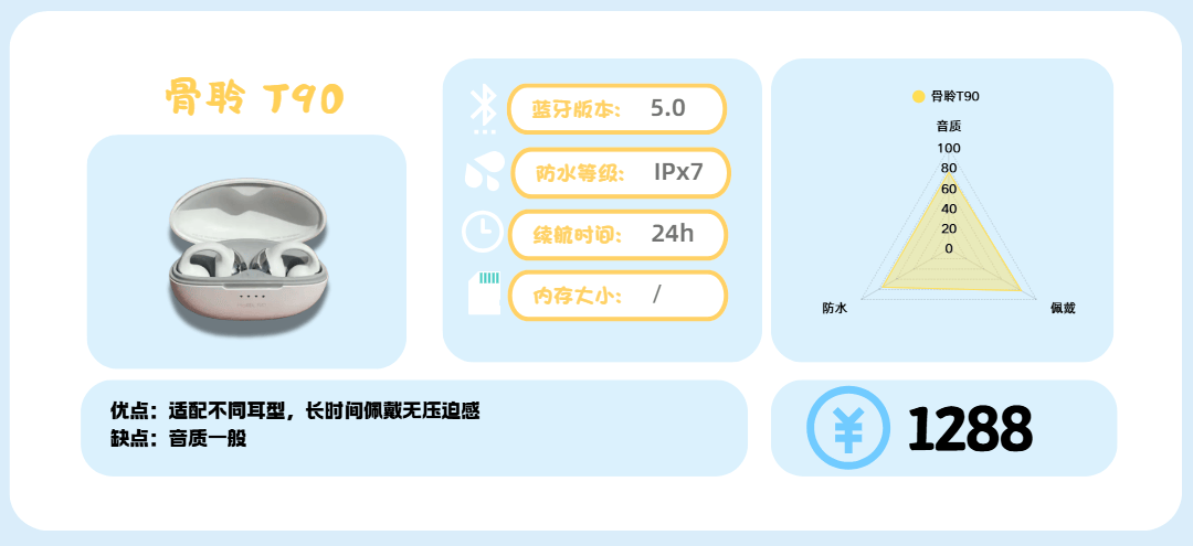 在音质方面,Profitx T90 搭载第 10 代声联 SoundSmart 骨传导振子技术,实现 4Hz-40kHz 的超宽频率响应,覆盖人类听觉范围,充分发挥声音传递性能,有效减少声音传输损耗,保证音质清晰自然。