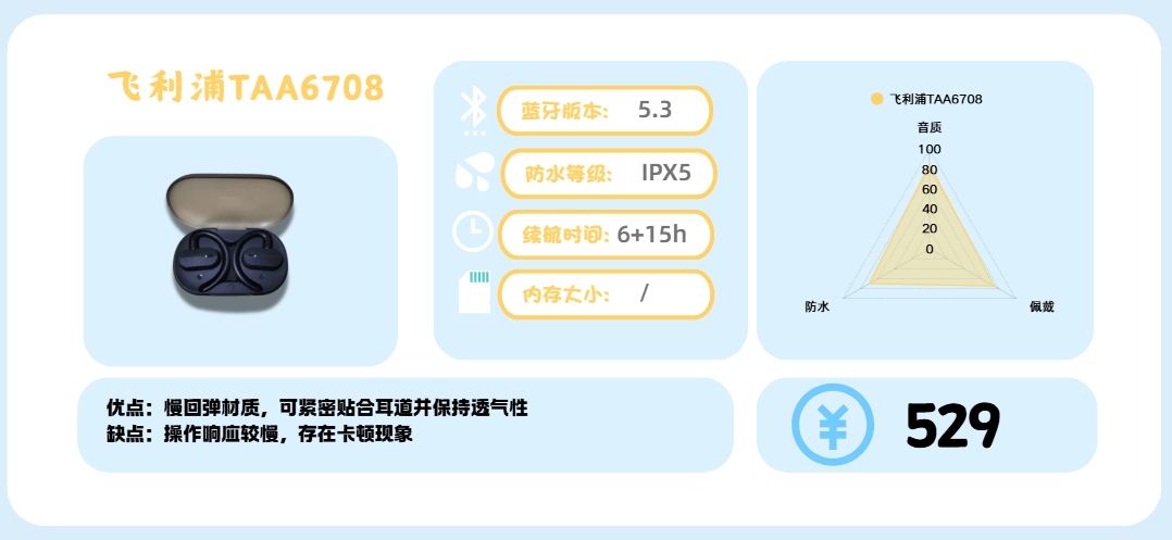 在音质表现上,TAA6609 采用骨传导技术,将声音通过颅骨传至听觉神经,保持自然清晰的听感。尽管低频震撼感不及传统入耳式耳机,但中高频表现出色,播放节奏明快的运动音乐时,乐器声与人声还原精准,契合运动节奏。此外,耳机对声音进行了优化,具备一定立体感,营造出身临其境的听觉体验。