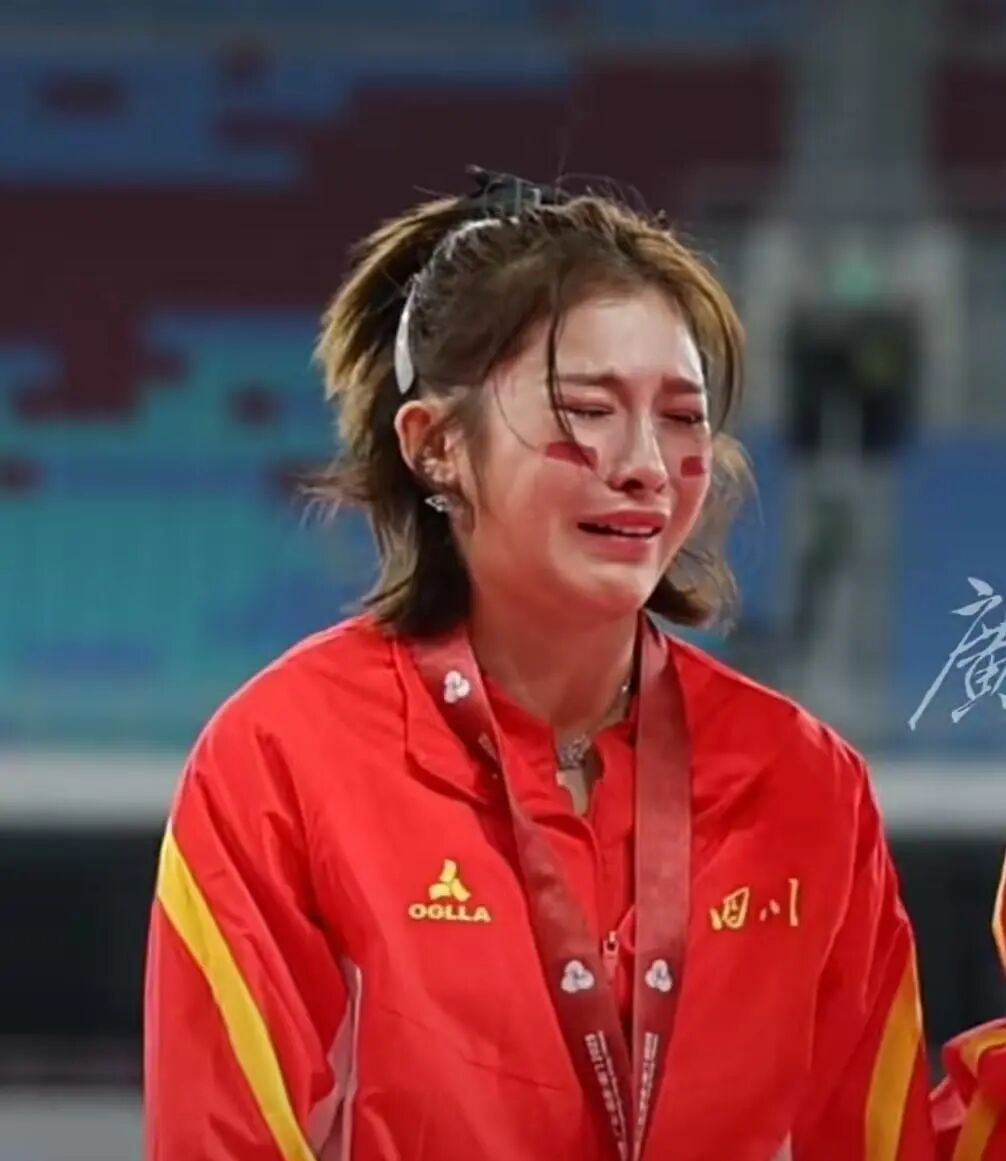 吴艳妮哭了。在领奖台上,银牌挂脖,她低头抹泪,肩膀微微发抖,又一次碎在了 0.04 秒的差距里。