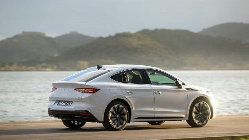 外观上,新车延续了斯柯达Škoda 家族式设计风格,整体线条锐利,头灯采用LED搭配,保险杠上方镀铬饰板沿用了燃油版车型的直瀑式设计,同时外框采用黑色进行点缀,下进气口采用了蜂巢式纹路,运动感十足。与此同时,新车车侧后视镜底座设计在门板上方,B柱后采用流线的斜背造型,风阻系数仅为0.234Cd;同时尾门中央配备ŠKODA字样,辨识度很高。