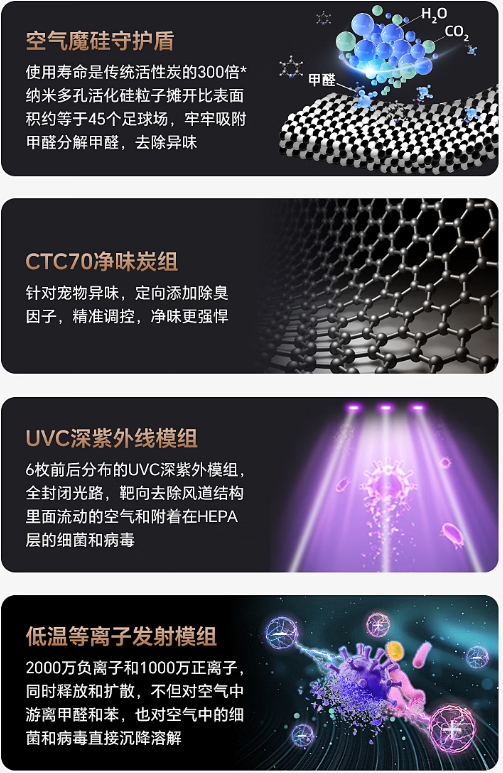 1. 四重分解技术:甲醛→水 + CO₂,无二次污染新颐 A8 搭载 “空气魔硅 + CTC70净味炭组 + UVC深紫外线模组 + 低温等离子发射模组” 的四重醛解系统,层层递进分解甲醛: