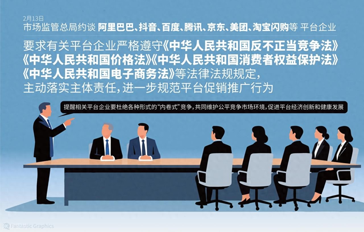 事实篇:一场指向明确的监管约谈2026年2月13日,市场监管总局对阿里巴巴、抖音、百度、腾讯、京东、美团等8家头部平台企业进行约谈。这是监管层首次明确使用“内卷式竞争”这一表述,标志着对平台经济发展模式的系统性反思。