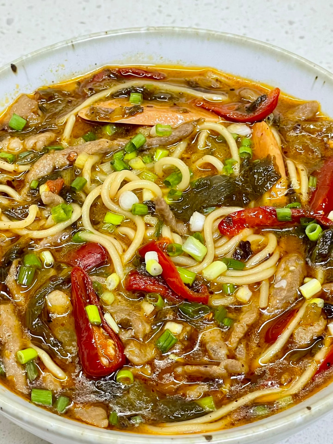 记得小时候生病没胃口,妈妈总会变出这碗酸菜肉丝面。她总说:"酸味开胃,热汤驱寒。"后来北漂租房,第一次尝试复刻时把厨房弄得烟雾缭绕,却意外发现酸菜在油锅里爆开的香气,和记忆里妈妈的味道分毫不差。现在每次煮面,都会多煮一份分给室友,看着他们狼吞虎咽的样子,突然明白:所谓美食,不过是把爱意熬成汤,把牵挂揉进面。