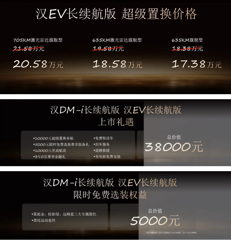 发布会上,比亚迪公布的价格与权益让现场响起阵阵掌声:汉DM-i智驾版售价16.88万~22.58万元,汉EV智驾版售价17.98万~23.58万元,对比同级别搭载智驾系统的车型,价格直接下探3万~5万元。更值得关注的是,比亚迪针对成都用户推出“专属焕新计划”——