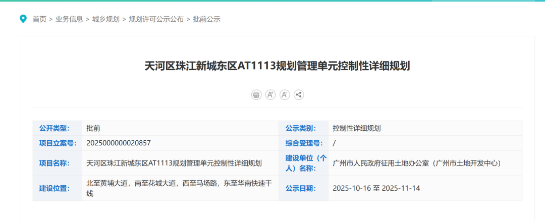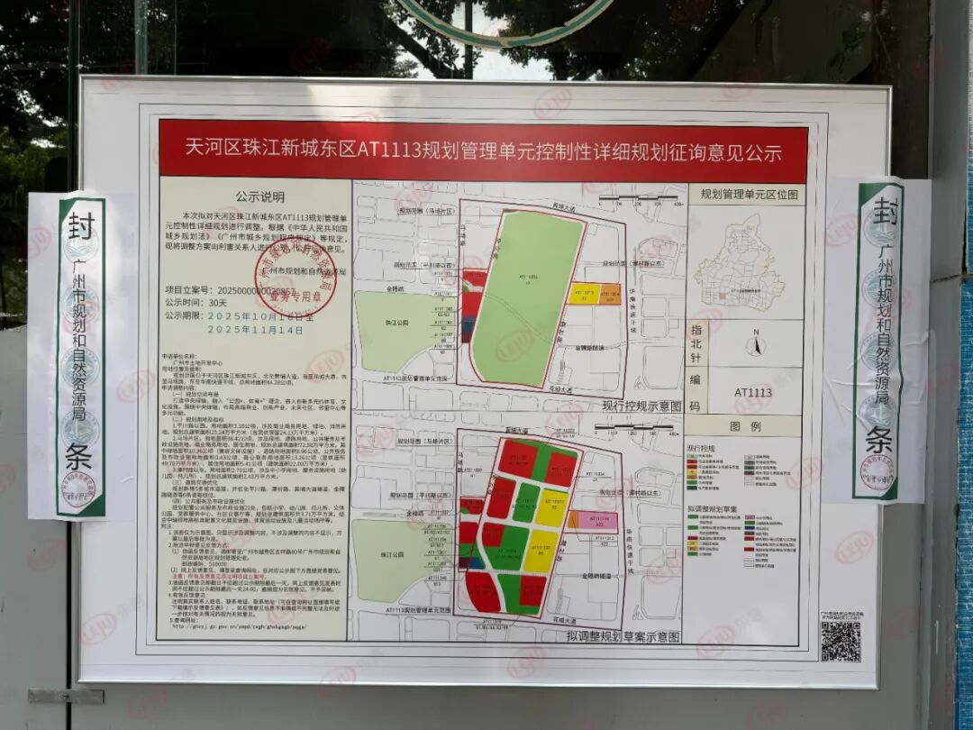 今天,广州规自局正式公布了《天河区珠江新城东区AT1113规划管理单元的控制性详细规划》。