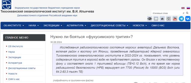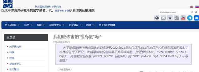 在这种情况下,俄罗斯远东符拉迪沃斯托克的俄罗斯科学院远东分院太平洋海洋研究所,于2024年8月30日公布了从前年开始对太平洋、鄂霍次克海和日本海进行的独立海水调查结果。