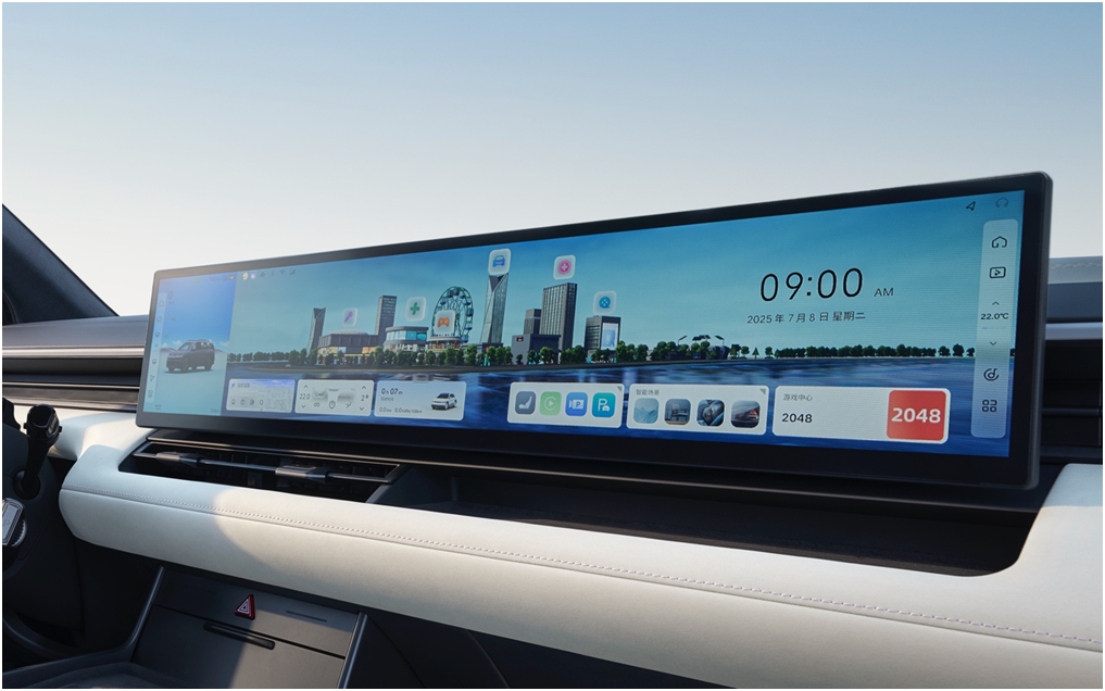 在视觉交互方面,EO羿欧配备一块27英寸超薄宽幕显示屏,兼顾驾驶席与副驾的视野与信息分区。该屏幕具备4K高清分辨率,支持1000cd/m²的高亮度输出,确保在强光和逆光环境下依然具备清晰可读性。其镁合金外壳在保证强度和抗腐蚀能力的同时,进一步压缩了整机厚度,指向同级最薄的车载大屏形态。