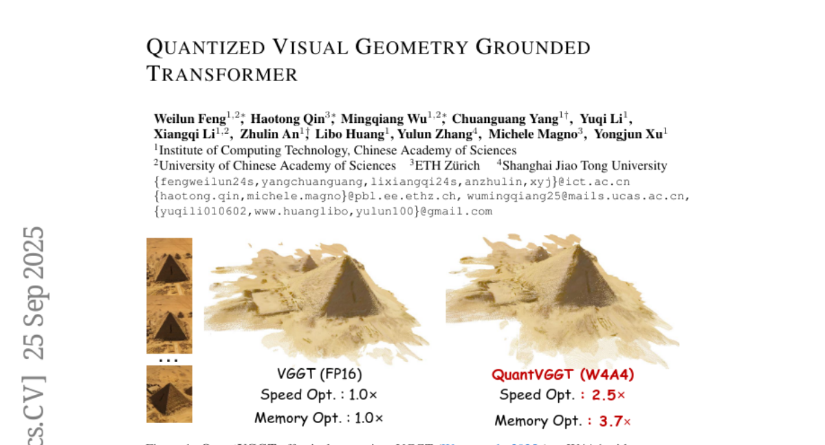 2025年,中国科学院计算技术研究所的冯伟伦、杨传光、安竹林等研究人员,与ETH苏黎世联邦理工学院和上海交通大学的学者们合作,发表了一项名为《量化视觉几何基础变换器》的重要研究。这项研究于2025年9月30日发布在arXiv预印本平台,编号为arXiv:2509.21302v2,为解决大型3D重建模型的部署难题提供了创新性解决方案。