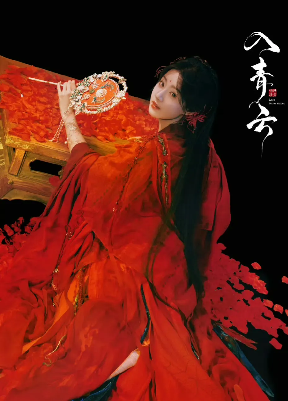 路透造型只是其中一小部分,真正的美图还得看剧方的剧照。剧照里,卢昱晓一袭红衣明艳似火,乌黑的长发垂在腰间,额间一点红痣,手里拿着团扇,回眸一望,目光流转,又美又欲。