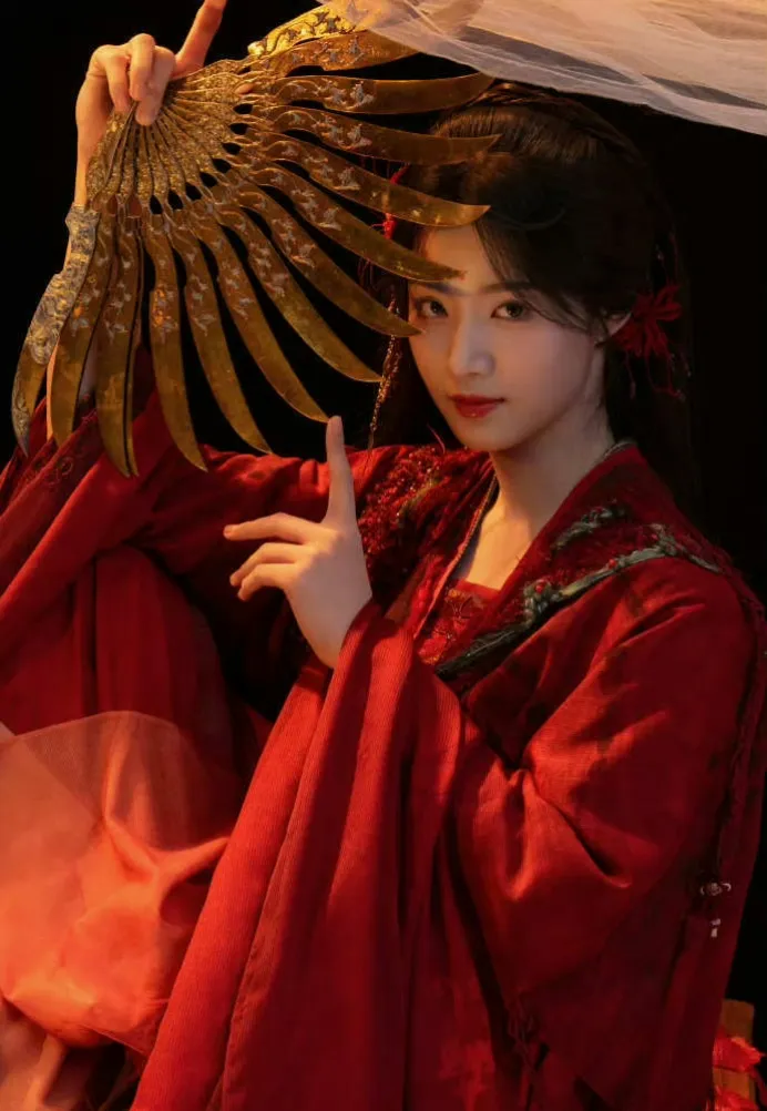 另一组红衣造型则是飒爽女侠风格,手里拿着刀具做成的折扇,指尖轻触,眼神凌厉,已经能感觉到女战神明意的杀伤力了。