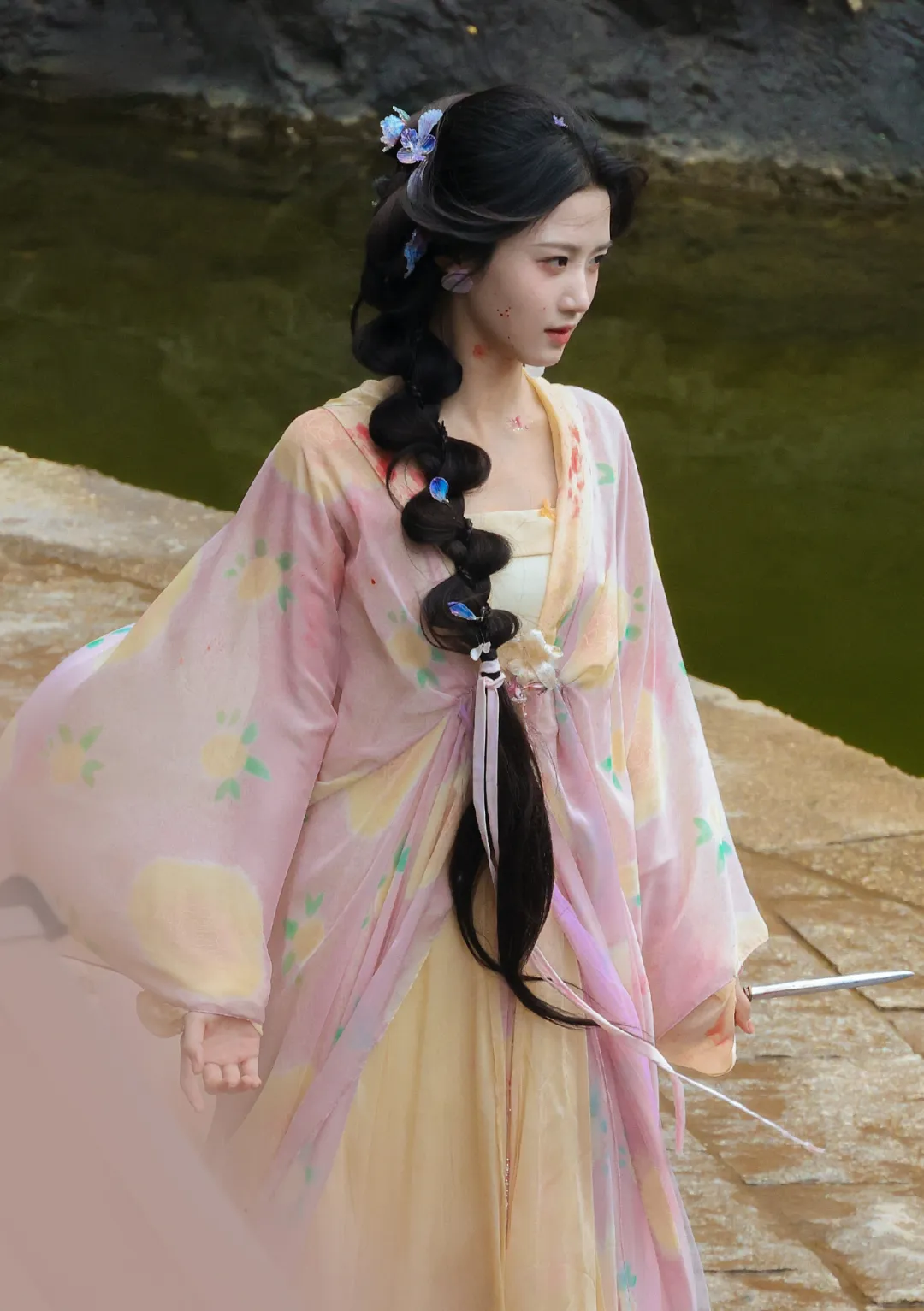 另一套粉色的衣裙花色一般,但腰间褶皱的收腰设计很有层次感,看起来非常飘逸。再加上别具一格的发型,整体造型很是亮眼。