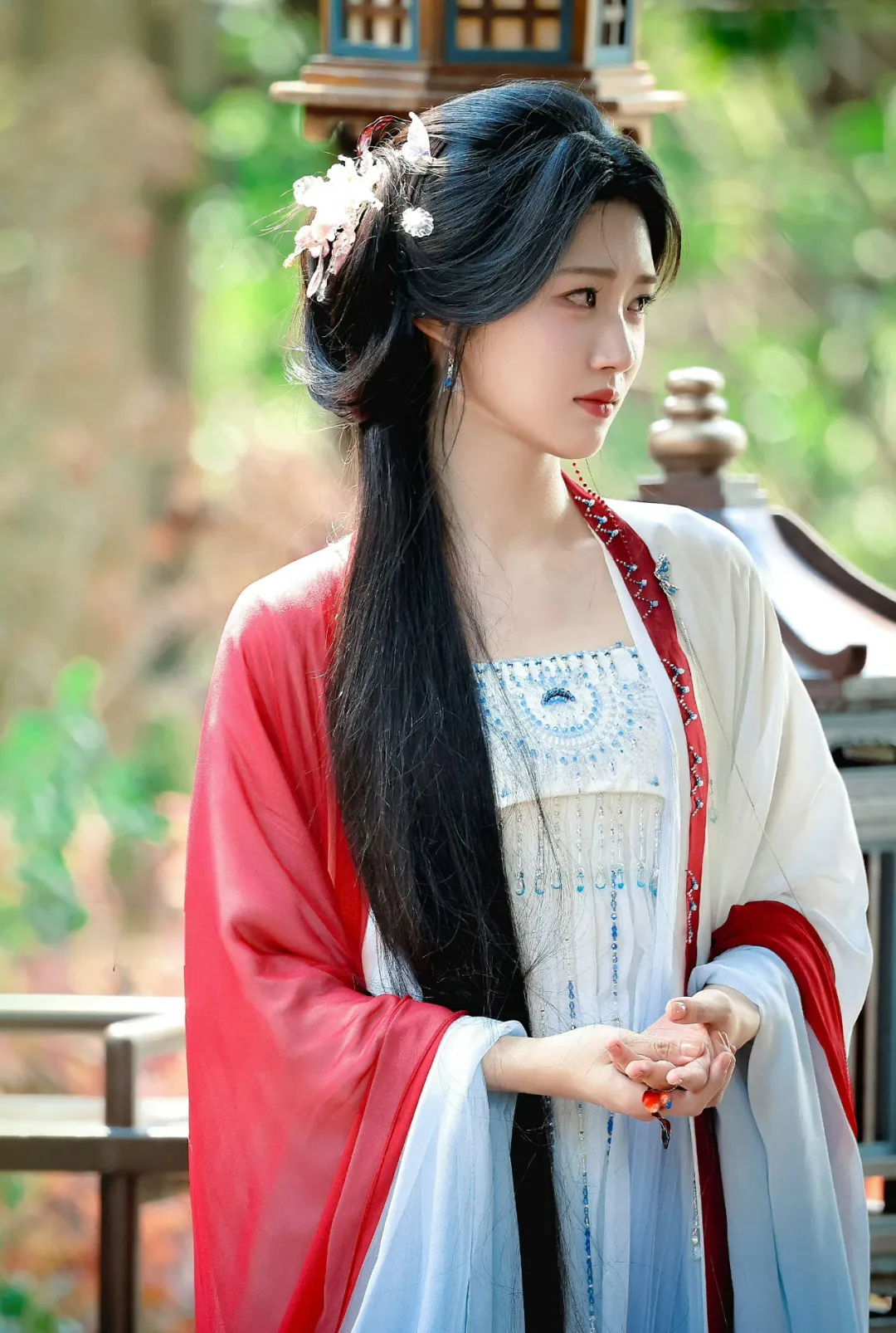 内搭是纯净仙气的白色衣裙,外搭一边是白色的阔袖,一边是红色的,又像是红色的披帛,整体造型看上起很有设计感,而且很是大气明艳。